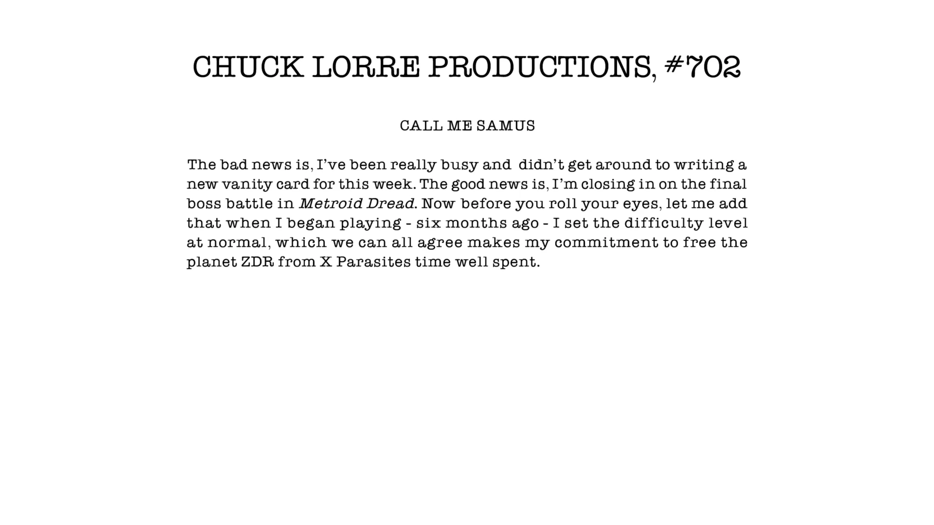 | “ | The bad news is, I've been really busy and didn't get around to writing a new vanity card for this week. The good news is, I’m closing in on the final boss battle in Metroid Dread. Now before you roll your eyes, let me add that when I began playing – six months ago - I said the difficulty level at normal, which we can all agree makes my commitment to free the planet ZDR from X Parasites time well spent. | „ |
