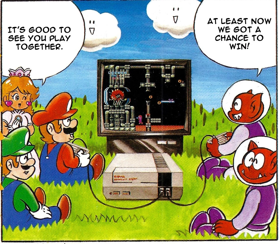 A Dutch edition of the magazine advertised the NES and NES Zapper in 1990, in the form of a comic featuring Mario and Luigi. The brothers were attempting to rescue Princess Peach, once again, from a group of aliens. After the surrender of their leader, Mario and the aliens are seen playing Metroid together in peace. The scene depicted is the Mother Brain battle.
