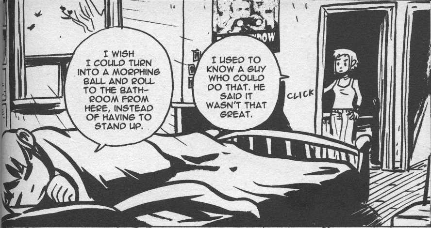 In this video game themed graphic novel, the titular character says, "I wish I could turn into a Morphing Ball and roll to the bathroom from here, instead of having to stand up." Scott's love interest Ramona Flowers then says, "I used to know a guy who could do that. He said it wasn't that great."