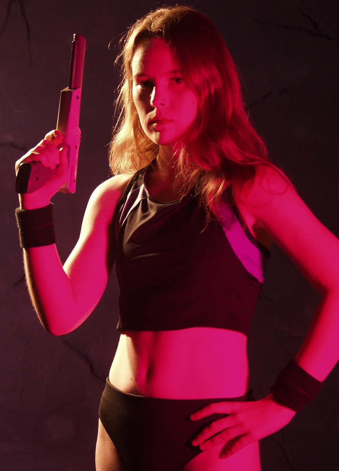 Humorously, the shoulders of Samus's armor are shaped like basketballs and in fact, in one picture from her photoshoot, she is holding one discarded shoulder like a basketball. Her eyes are brown, an inconsistency with the Metroid series, in which they are always blue (green in Metroid: Other M).