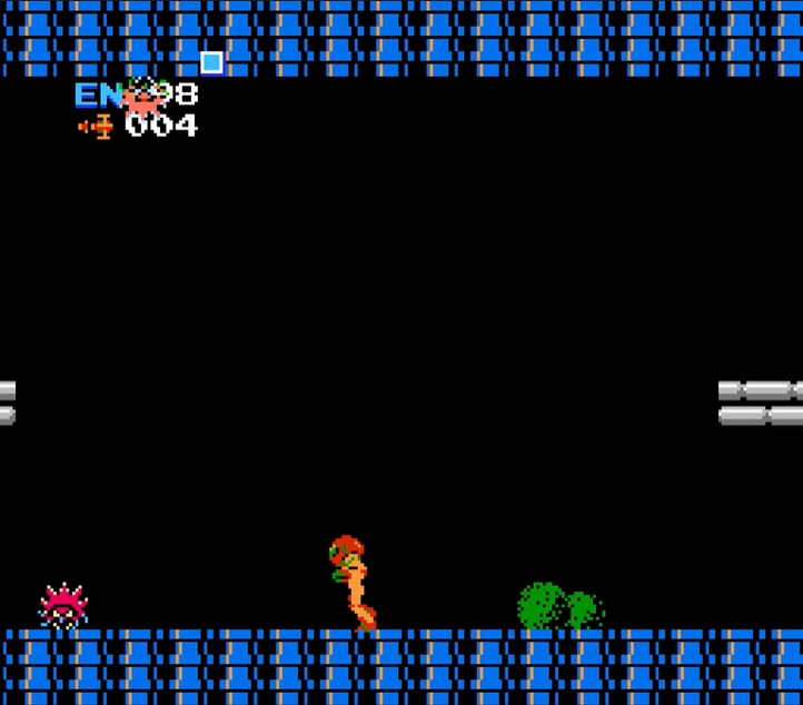 The corridor-connecting room is a room in Brinstar. It appears, with differences between versions, in Metroid and Metroid: Zero Mission. In Metroid, the initial room consists of green brick tiles and reddish rocks in the ceiling and floor, with two bushes on the ground. A pit of acid is visible below the ground, with a single Ripper patrolling above. Neither can be interacted with. A column of bricks in the ceiling are made of Fake Blocks, which can be cleared out to reveal a hidden area above.