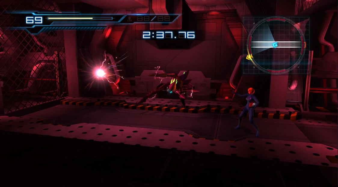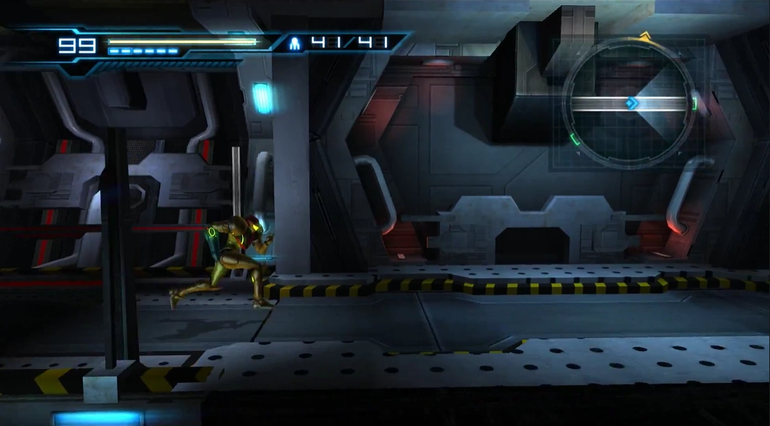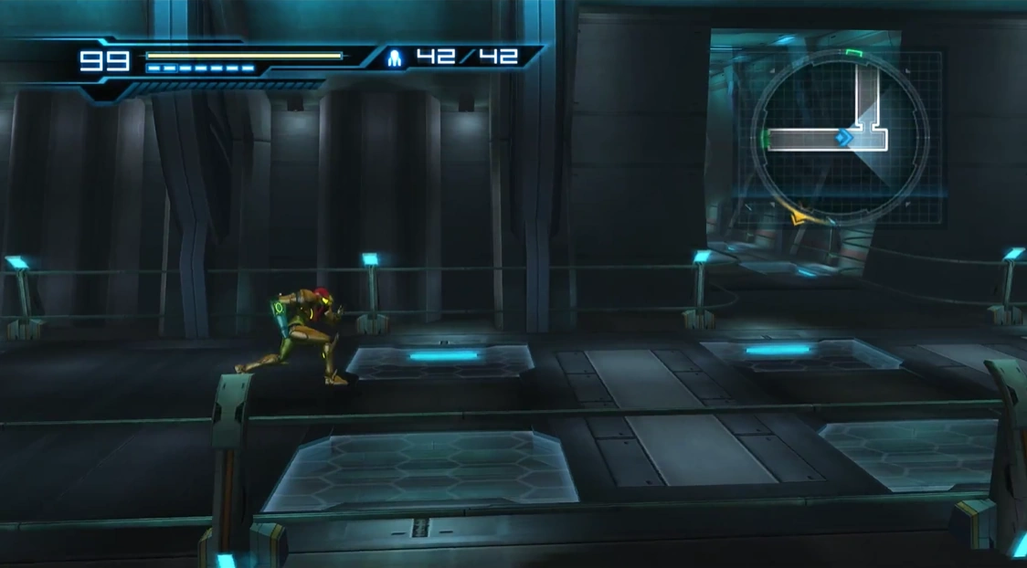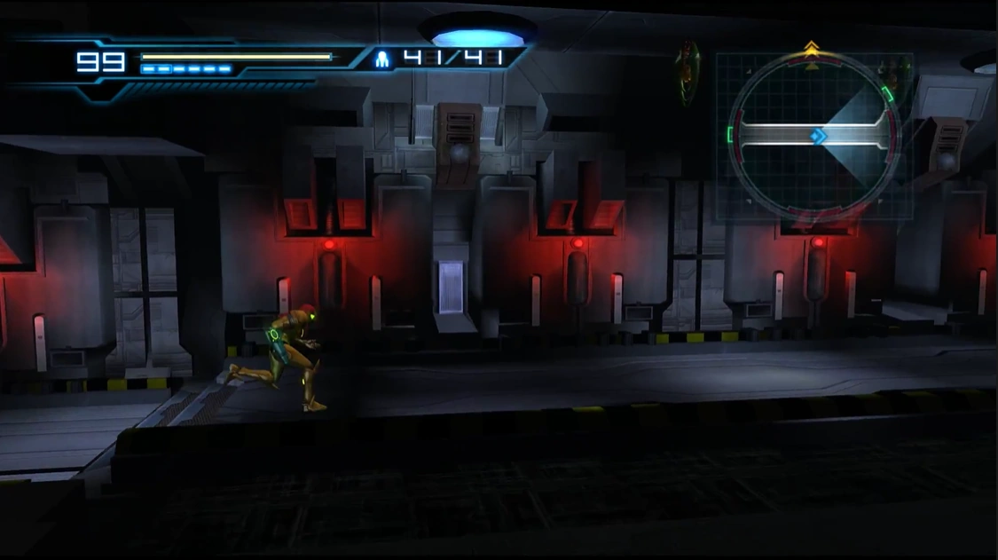 The "catwalk access" is a loosely L-shaped corridor with a square-shaped exit, that connects the Cargo Hold to the catwalk. On the first visit, the room has dim lighting and is empty. In the previous room, Samus watches the 07th Platoon run ahead through this corridor, and waits until they have passed to follow. After the credits, the room remains empty until the countdown sequence, where two large obstructions and closed shutters have appeared. Samus can slide under the obstructions and shoot the shutters open with her Paralyzer. A Super Zebesian will appear in between the shutters, which Samus can ignore if she shoots the second shutter quickly enough. A third shutter will begin lowering, which Samus can slide under quickly.