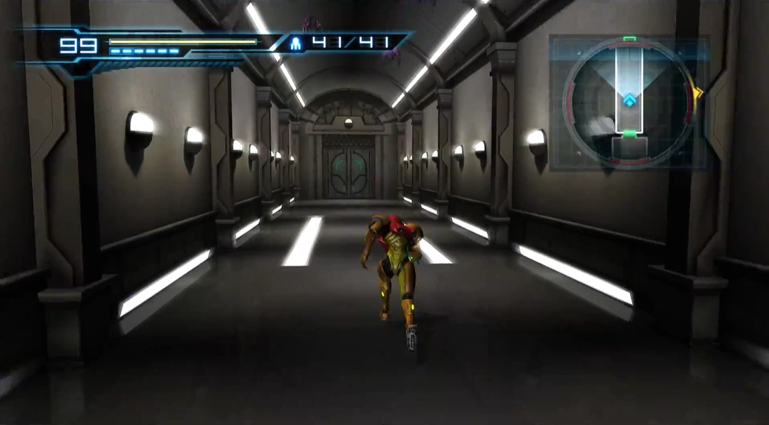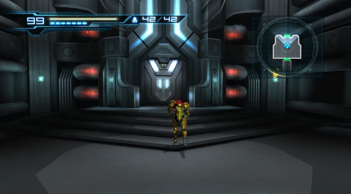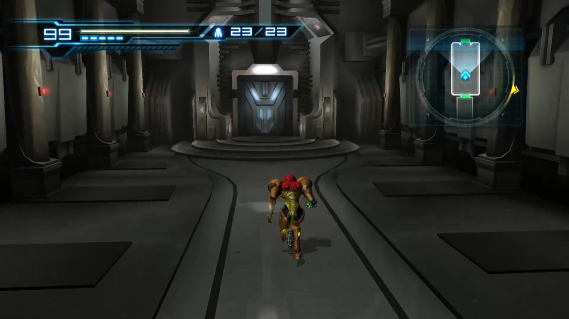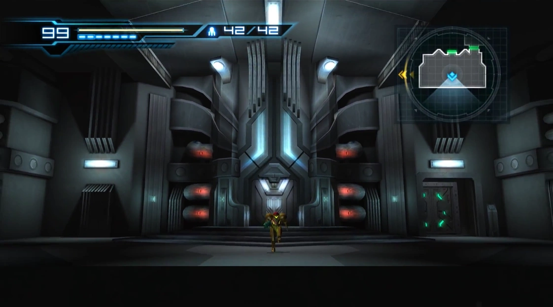 The "Skree corridor" is home to a group of Skrees, but has no other unique features. It leads from the catwalk to the "conference hall". The door to the latter room is present on the back wall, with the corridor curving to the left near it. During the countdown sequence, this room is empty of enemies. A shutter will begin to close on Samus, forcing her to slide under it, and then again under a block of debris. She will then be boxed in by two shutters and have to shoot the one in front of her open in order to leave.
