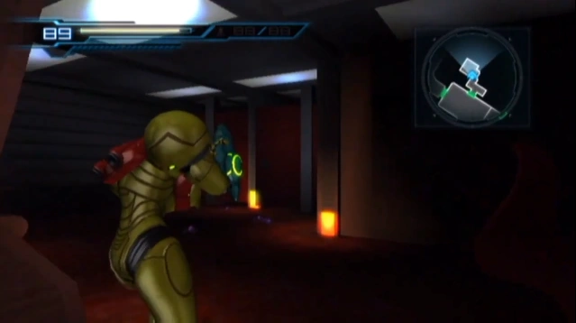 This is the first Navigation Booth in the game. When Samus enters the room for the first time, it is still active despite the rest of the Main Sector having no power. When she uses it to save, the light that surrounds her while saving is orange instead of the usual green. On the first visit, and the subsequent second after restoring the electrical system, the door to the long hall is locked until the Booth is used. During the countdown sequence, the Booth is covered in flaming rubble, preventing its use. Even if it were not, it would not be usable by Samus at that time since she is in her Zero Suit.