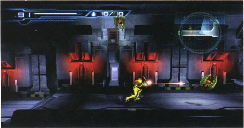 The "lower vent hall" is reached through the door on the higher level of the Main Sector lift hub and leads to the tall elevator shaft. As the name implies, there are three large vents in the ceiling. The one closest to the elevator shaft door has an inactive Fly Pod in it. Samus can destroy it and Kick Climb (or later, Shinespark) up the vent to find a lone Missile Tank inside. Her last chance to obtain this tank will be when she is using the elevator shaft after leaving the Control Bridge. The other vents contain nothing.