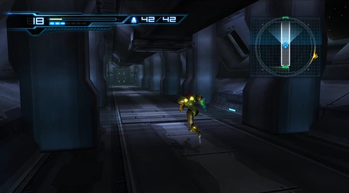 The long passageway is a lengthy corridor in the Main Sector of the BOTTLE SHIP. It appears in Metroid: Other M. Aside from its purpose of connecting the Spaceport, the Landing Site of the BOTTLE SHIP to the Cargo Hold, this room is of little importance. As indicated by its name, it is long, and curves around in an L. The first time Samus passes through this room, it is dimly lit by a series of red warning lights on the walls. The lack of light is likely due to the terminal in the System Management room not being online.