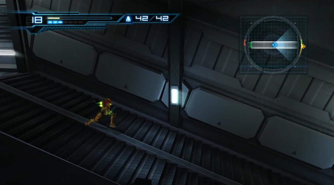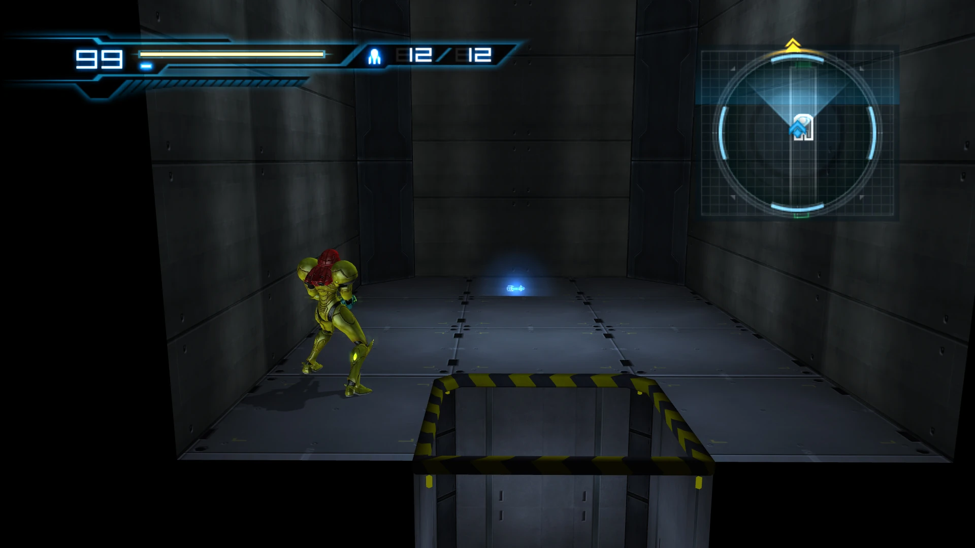 The tall room is a vertical shaft in the Main Sector. It appears in Metroid: Other M. This is a tall, vertical room with an elevator in the center. The walls are lined with platforms that have yellow and black Grab Ledges on them, with a design similar to crossing tape. These are how the room is ascended when there is little power in the Main Sector. Each walkway platform has a set of glowing green lights, with flashing red lights underneath; both are likely the result of auxiliary power.