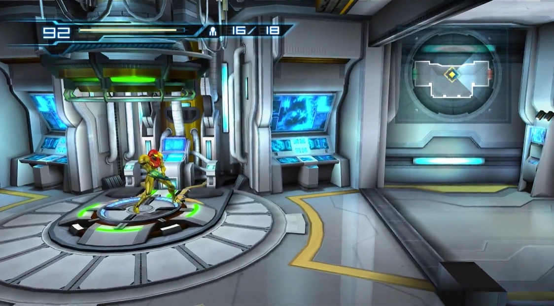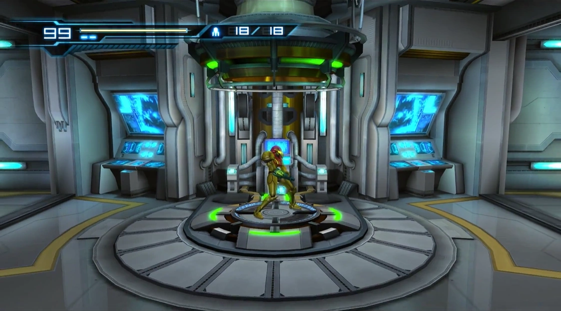 The Floor Observation Room is a room in Sector 3 / Pyrosphere. It appears in Metroid: Other M. The Floor Observation Room is located in an indoor facility. It is likely that the ringleaders observed various experiments in this room. In the center of the back wall is a raised platform with a staircase, and a Terminal with two seats in front of a desk. These are separated from the rest of the wall by a pair of buttresses. On either side of this are a pair of large wall-mounted screens, one of which is displaying static, and the other displays unknown schematics.