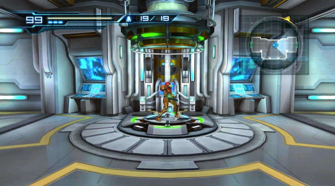 Navigation Booth C is the third Navigation Booth in the Pyrosphere. It immediately follows the volcano corridor, in which Samus would have lost a lot of energy from exposure to extreme heat. When Samus uses the booth for the first time, the map populates with the location of the next Navigation Booth, as well as the Main Sector elevator. On her first visit, the room may rock a little from the volcanic meteors impacting the floor outside.