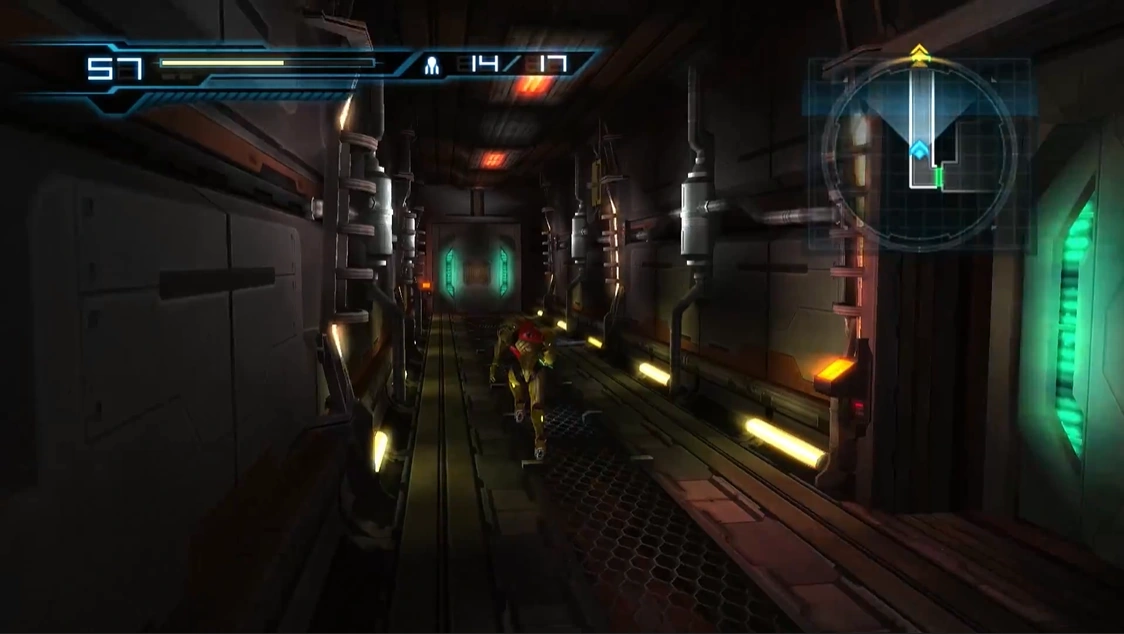 The long elevator shaft is a room on the BOTTLE SHIP in Metroid: Other M. It acts as a connecting shaft between Sector 1 / Biosphere and Sector 3 / Pyrosphere. The room is partially playable, and cannot be accessed again after Samus passes through it. The shaft is accessible from the Biosphere Test Area, outside and to the right of the Exam Center. It may even be part of the Exam Center building, as the entry door is seen blending into a projection of an open field environment with bushes and trees. This is because after being wounded by Anthony Higgs, the Mystery Creature threw itself through the door, damaging the holographic projection.
