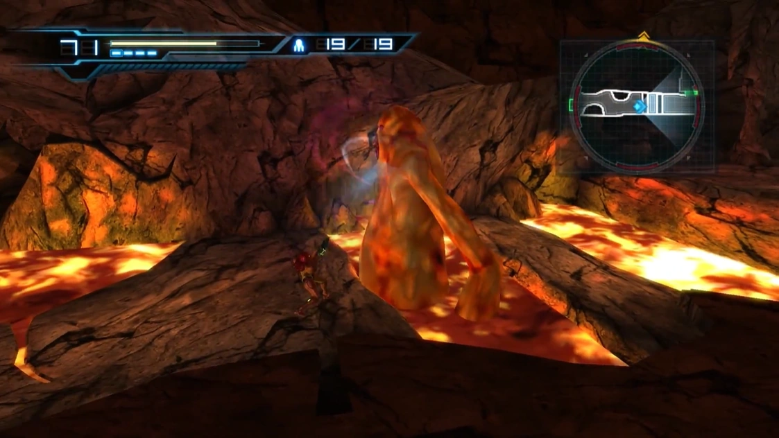 The "lava ponds" are accessed from a high ledge in the lava cavern, which is reached by ascending three platforms near the door to the infested L-shaped corridor and using a series of Grapple Points. The room is a short hallway inside a cave with several fissures of exposed lava. It is not difficult for Samus to navigate around the pools, although there are several Magdollites which can make movement difficult unless they are destroyed. It leads into a Navigation Booth.