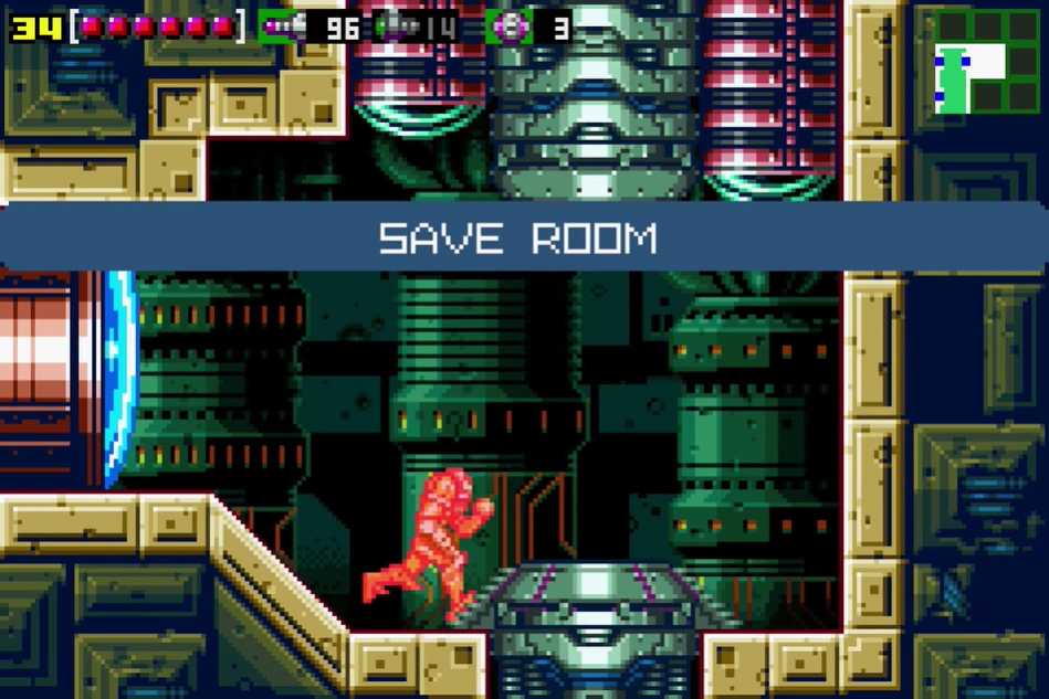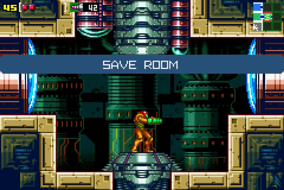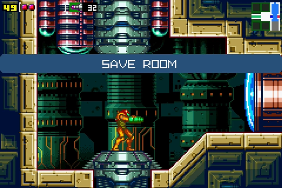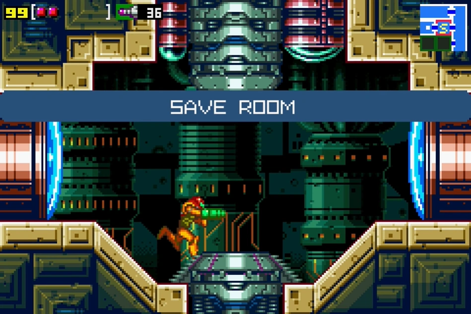 "Save Room 2" is the second Save Room in Kraid. It can only be accessed from the Chozo machine hall. It leads back into the apex launcher shaft, in an enclosed space. This is the only Save Room before the Acid Worm battle.