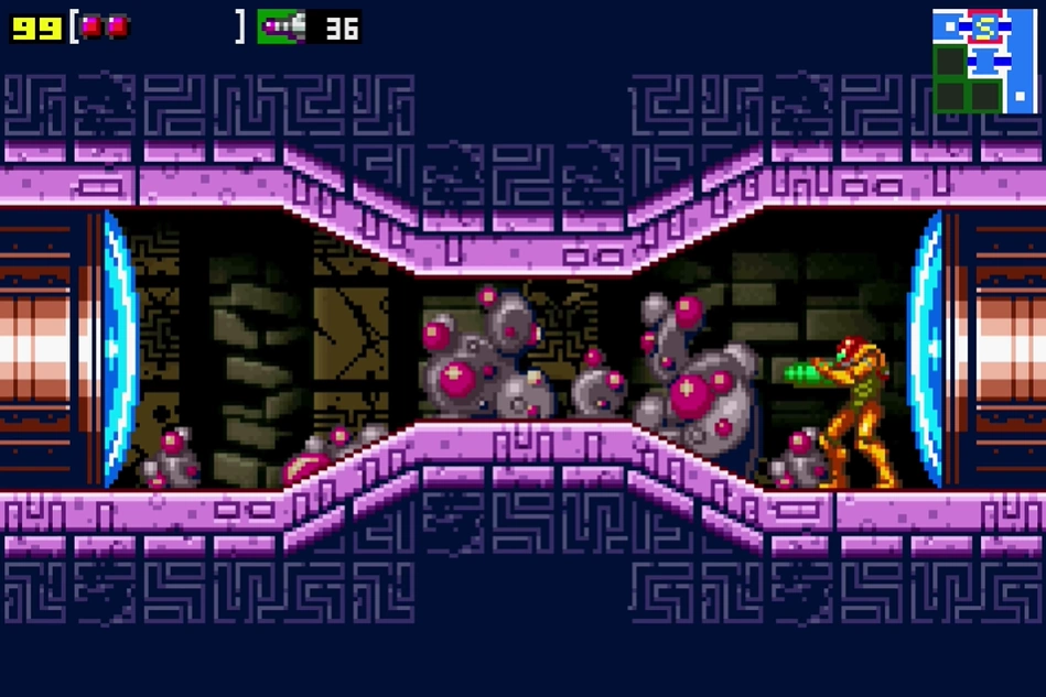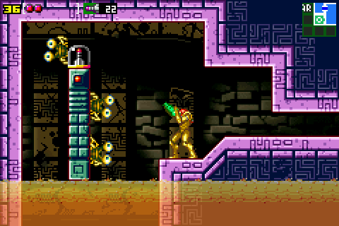 "Mini-Kraid's room" is a room in Kraid. It appears in Metroid and Metroid: Zero Mission. In the former game, it is the location of Mini-Kraid, who is absent from Zero Mission. Another version of this room appears in Super Metroid, where it is part of Brinstar. In the remake Metroid: Zero Mission, the room's appearance has been significantly changed and Mini-Kraid has been removed. It is now a larger, single chamber that connects to multiple other rooms and consists of purple architecture, with large cacti and ruins visible in the background. The drain drops Samus into a short shaft that is blocked off by an impenetrable Chozo Block with the Space Jump's symbol on it. Samus can lay a Bomb in the floor directly beside it to drop through a short tunnel and Pit Block into the rest of the room.