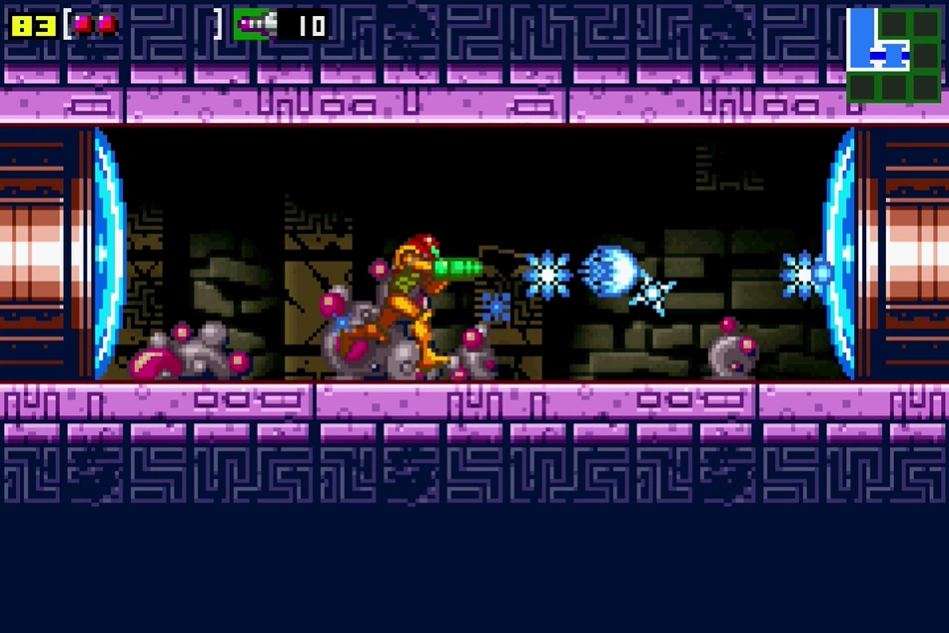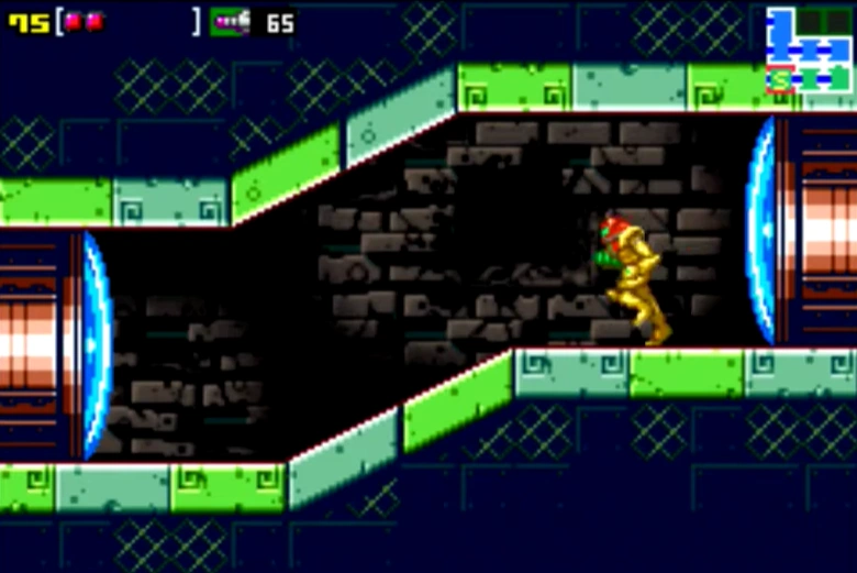 "Kraid's gauntlet" is a room in Kraid. It appears, with significant differences between versions, in Metroid and Metroid: Zero Mission. In Zero Mission, this room's appearance has been changed entirely with the increased memory size offered by the Game Boy Advance. It is now a pit with steep ledges leading to two doors on both sides. Samus can enter this room from either of two shafts after the ancient Chozo machine is activated, but visiting it is optional. At the base of the pit are three Sidehoppers, which can be ignored but may pose a nuisance. Near the right entrance is a walkway of Pit Blocks, next to a solid platform with a zip line sensor. It is easy to distinguish the fake platforms from solid as the fake platforms are constructed out of grid-like blocks.