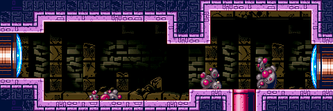 "Worm access" is a new room that did not exist in Metroid. It connects between the apex launcher shaft (in the enclosed part only accessible through the Chozo machine hall) and the Acid Worm's room. It is a short passage with a narrow center; the ceiling and floor being raised/lowered into the shapes of trapezoids. Beyond this, the room's features include hieroglyph-like symbols etched into the ceiling and floor, a strange cacti and ruined walls in the background.