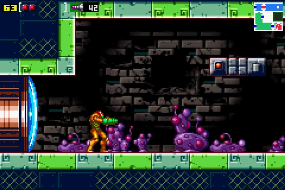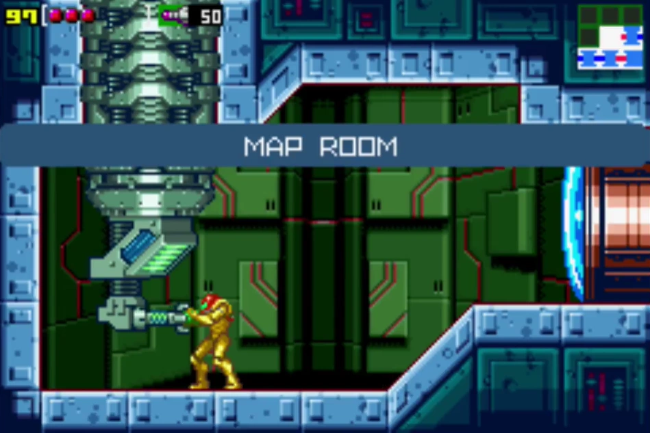 The Map Room provides Samus with an opportunity to download a map of Kraid. It is only accessible from the pipe shaft. When downloaded, the map reveals rooms such as the corrosive pool, Kraid's gauntlet and the upper part of the pipe shaft. It does not reveal any secret rooms or those leading directly to Kraid beyond the hidden drop and replenishment station.