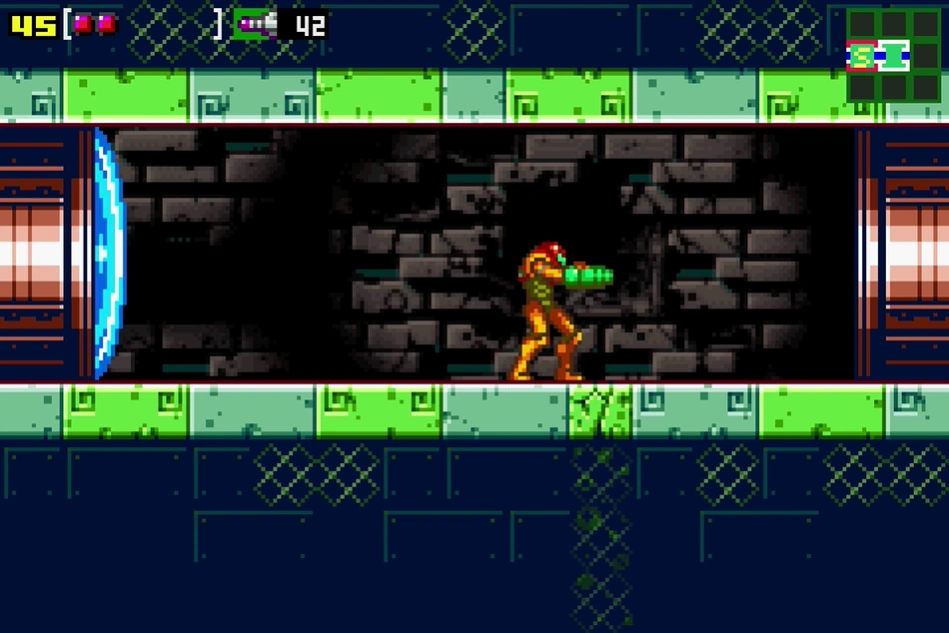 "Kraid's room access" is a room in Kraid's Lair/Kraid. It appears, with differences between versions, in Metroid and Metroid: Zero Mission. A separate version of this room appears in Super Metroid. In Zero Mission, the room has been slightly enlarged vertically, and shrunken in width. Its floor and ceiling now have a slight incline beside each door, but the room retains its bridge over acid and green architecture. A Gadora now guards the entrance to Kraid's room, and must be killed to access the boss. Geegas no longer spawn here, and the entrance from the "hidden drop" has been removed, since that room now leads into the slope beside this one. When Samus defeats Kraid, she has the option to collect the Speed Booster and use it to run back through a lower passage in this room, breaking through a wall of Boost Blocks in the slope room. If she does not collect the Booster, she can still use this path, but will need to find a hidden tunnel in the ceiling above the Boost Blocks.