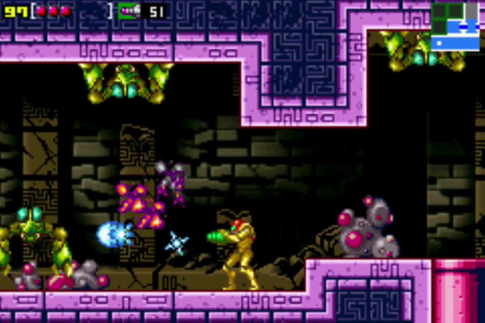 Using the launcher in Morph Ball form propels Samus up through the glass tube to the top. The tube is filled with six Rippers, all of which are killed when Samus collides with them. The force of her hitting the underside of a midair wall is enough to knock two Zeelas off their perches above. Samus will then land in a short tunnel. After climbing out, she finds a wall on the left and the midair wall she collided with on the right, each with two alcoves for her to jump to using her Power Grip. The last alcove has a Fake Block in it, which can be removed with a beam shot. Samus can then climb to the top of the shaft, to be able to access the room with the ancient Chozo machine. The second and third doors are found below the uppermost door, but the second highest can only be entered from the machine's room. A Pit Block underneath the door to that room drops Samus to the third door, which leads toward the Acid Worm's room. This room has 7 Zeelas and 6 Rippers.