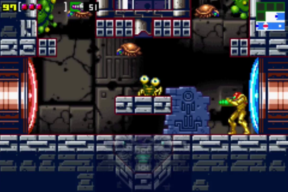 "Kraid entrance shaft" is the first room in Kraid's Lair. It appears in Metroid and Metroid: Zero Mission. In Zero Mission, the room is somewhat shorter owing to the Game Boy Advance's smaller screen, but has not been changed much. Its walls are now a dull blue-gray and silver, with each block still comprised of multiple bricks. The background depicts ancient ruins, presumably Chozo. The bushes lining the walls are thicker and appear to have pustules. There are now more midair platforms, and a fake floor of blocks (colored blue) exist under the midair rectangular block; the floor can be destroyed.