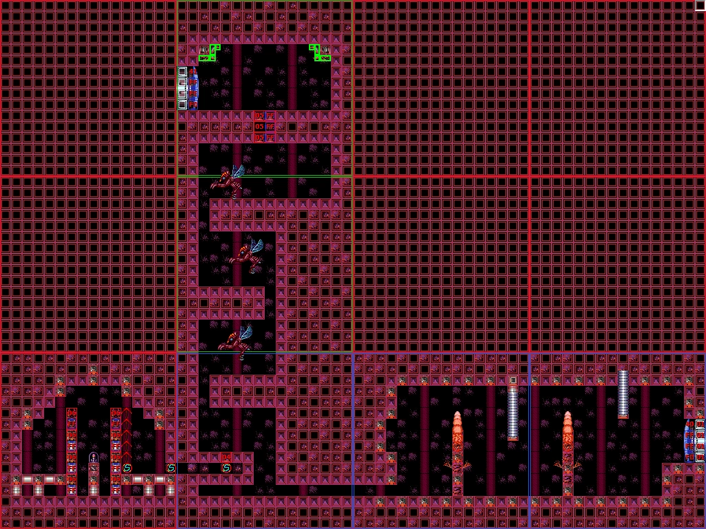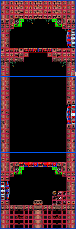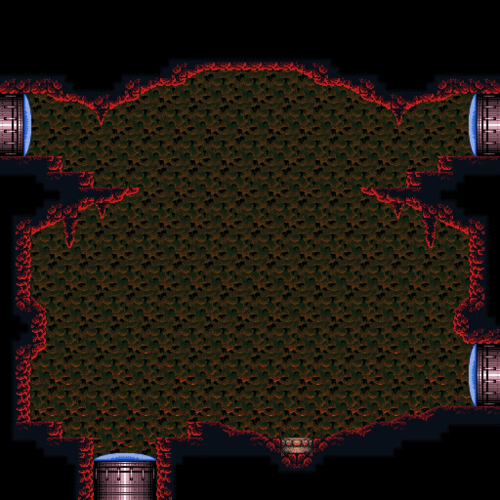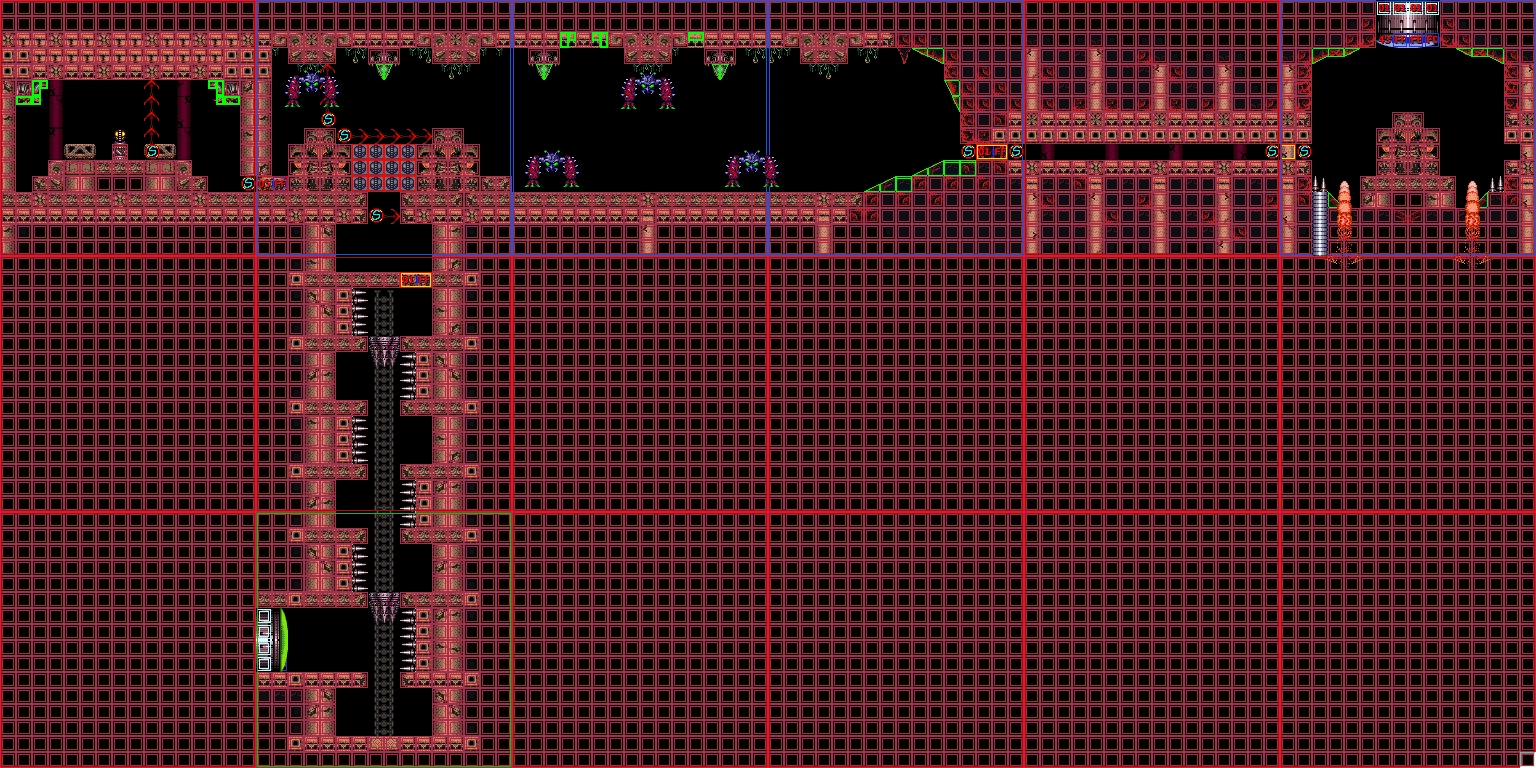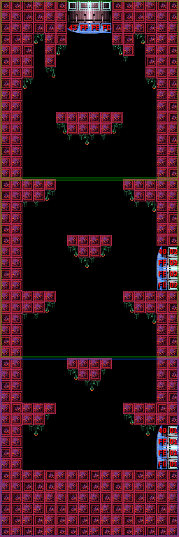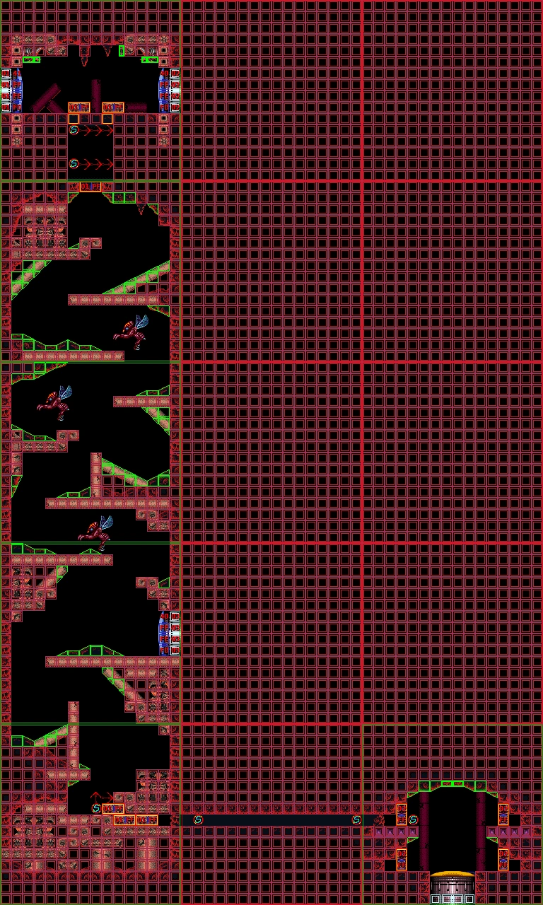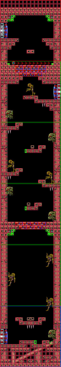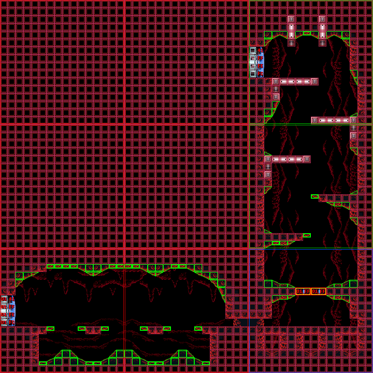 In the vertical shaft are multiple ledges and midair platforms formed out of rock, with short sets of steps leading to a Green Hatch in the floor. Through here is the room where Samus confronts Crocomire. Notably, the top of the vertical shaft is near identical to an unused room in Norfair, which is not accessible ingame but can be seen using the game's unofficial level editor, SMILE.