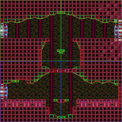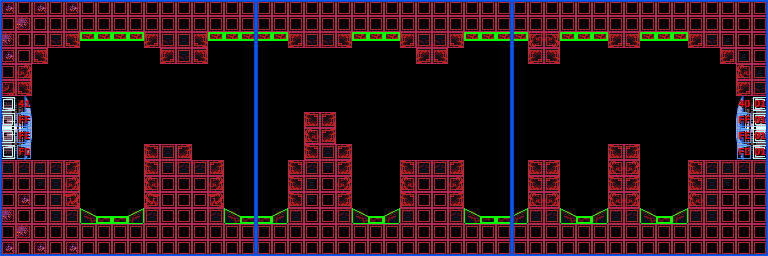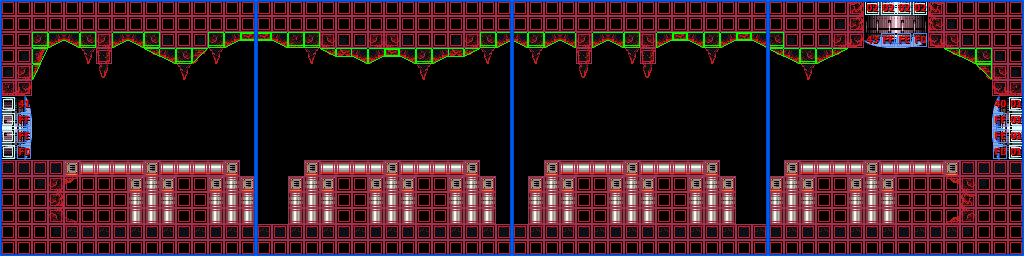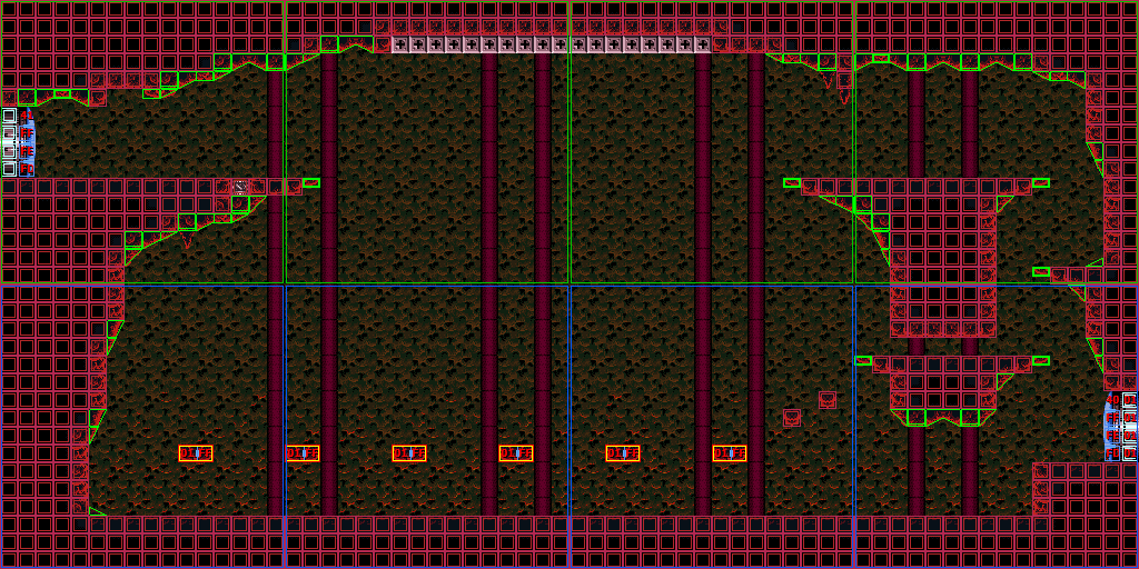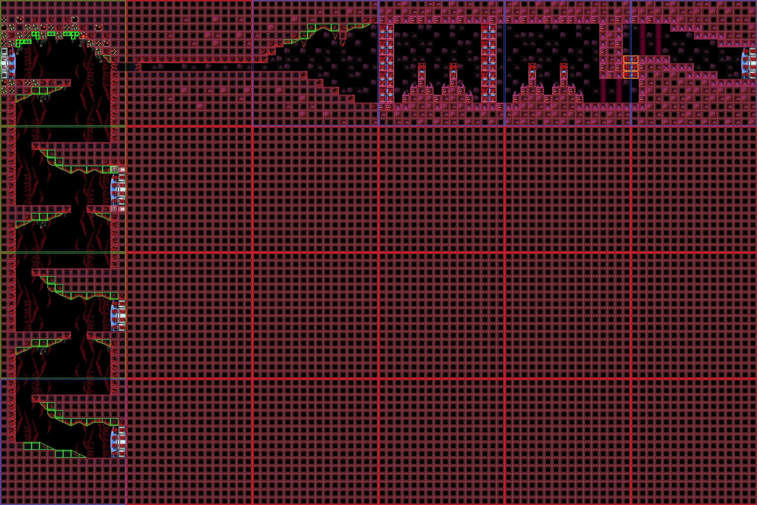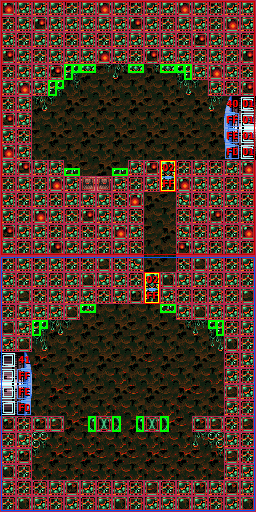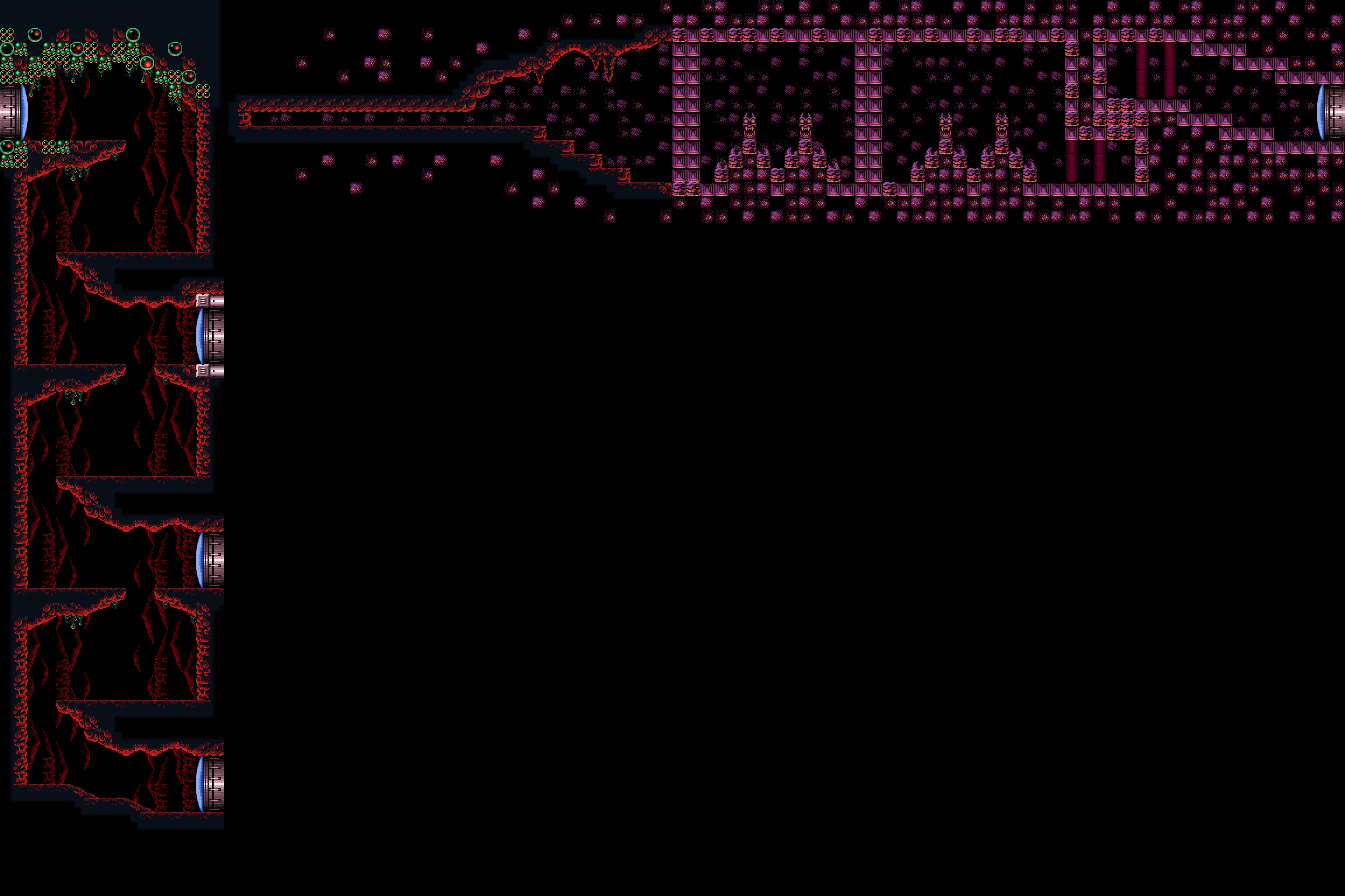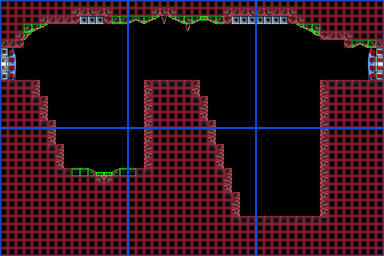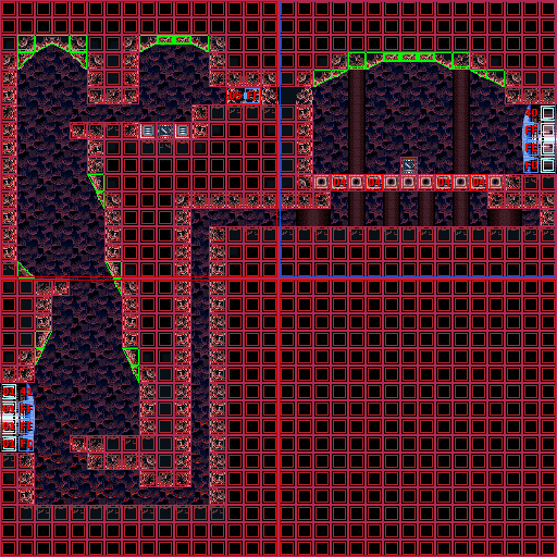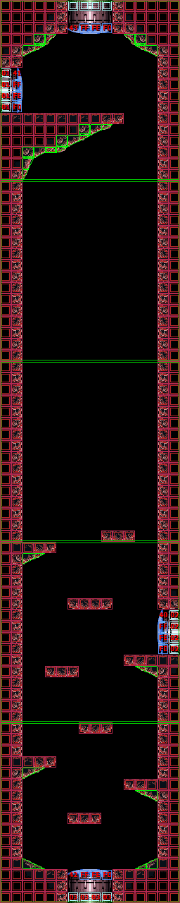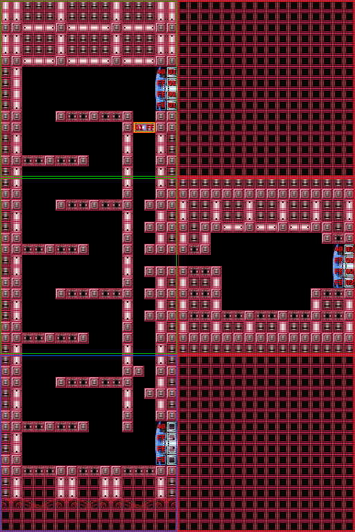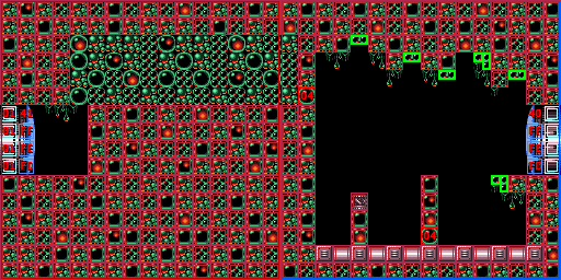 In the vertical shaft are multiple ledges and midair platforms formed out of rock, with short sets of steps leading to a Green Hatch in the floor. Through here is the room where Samus confronts Crocomire. Notably, the top of the vertical shaft is near identical to an unused room in Norfair, which is not accessible ingame but can be seen using the game's unofficial level editor, SMILE.