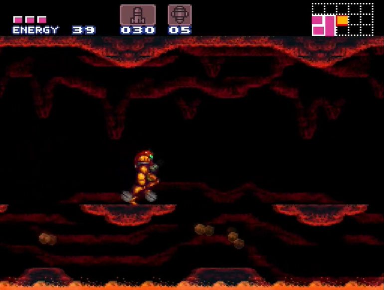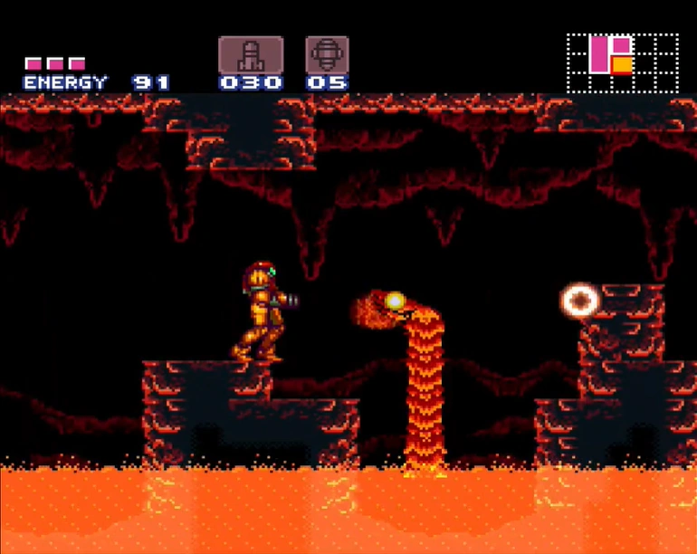 The Lava Lake is a room near the lowest point of Norfair in Super Metroid, close to the chamber where Ridley is fought. The room is composed primarily of jagged cave rock, but it also houses structural ruins of Chozo origin. When Samus enters the Lava Lake for the first time, an earthquake will occur. Scalding-hot lava begins to rise from the ground, and Samus is forced to quickly ascend the room to avoid being engulfed in it. Ascension is achieved by a combination of the Screw Attack and Space Jump, as well as use of midair platforms. If Samus returns to this room later from the other entrance, it will remain filled to the brim with magma apart from the highest platform, making it very risky to attempt to go back through the other door.