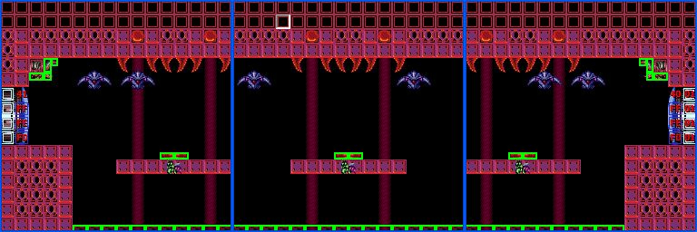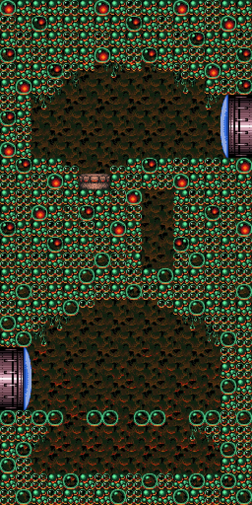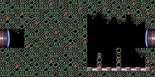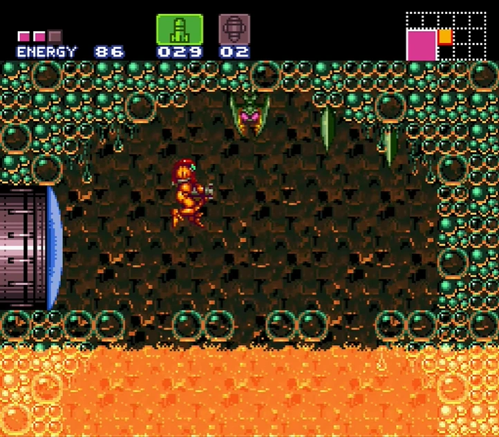 The "Bat Cave" is a short shaft found through a door on the upper right side of Bubble Mountain. It retains that room's extreme heat and green bubble-like material. Initially, it appears to be a small chamber with three Skrees hanging from the ceiling, a shallow pool of lava and four pairs of large glass bubbles that can be stood on as platforms. Shooting at the ceiling in between the Skrees reveals a hidden shaft above, leading to a higher chamber. An Air Hole that spawns Gamets is to the left, and a door to the right. This leads to the Speed Booster.