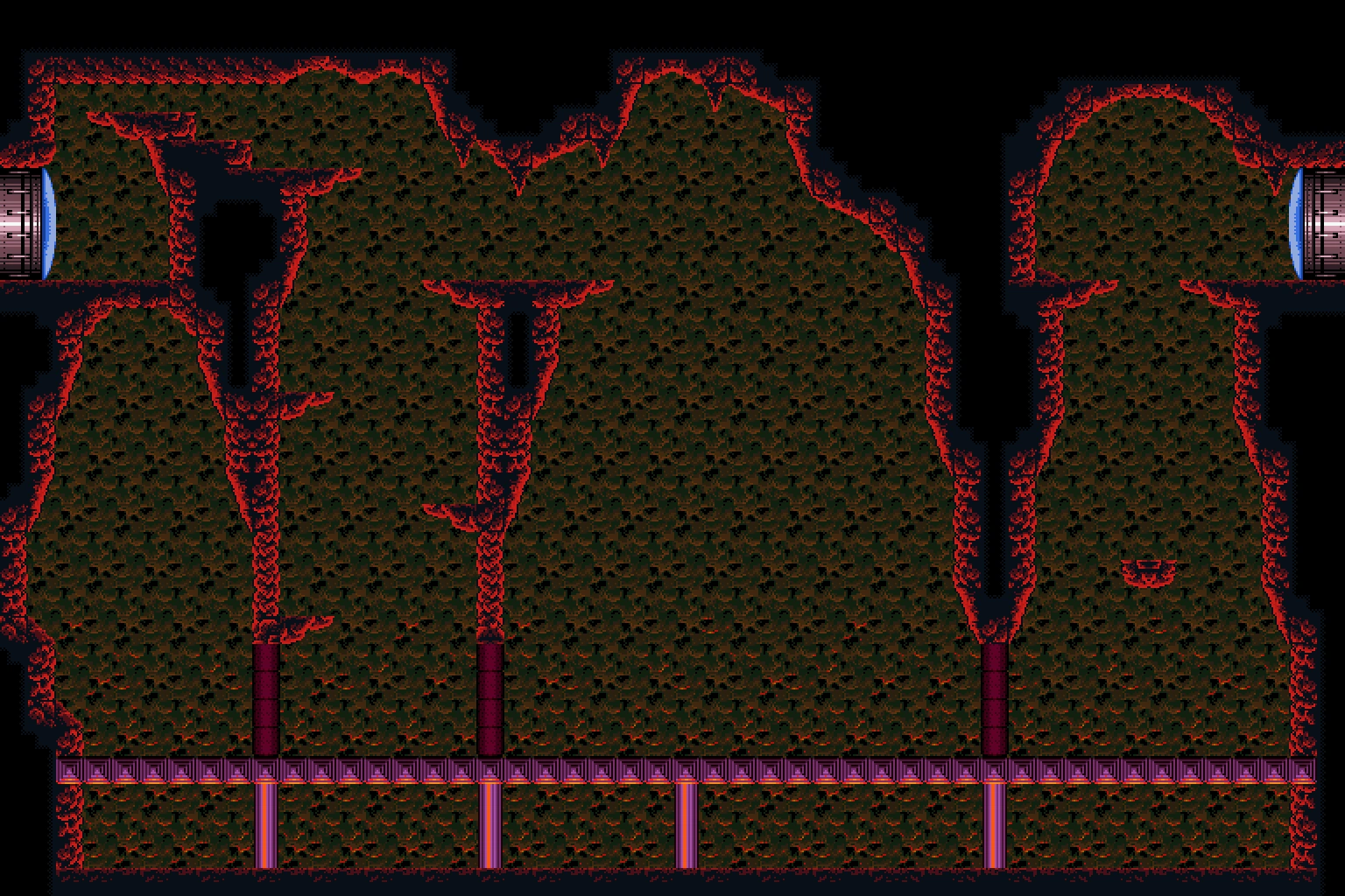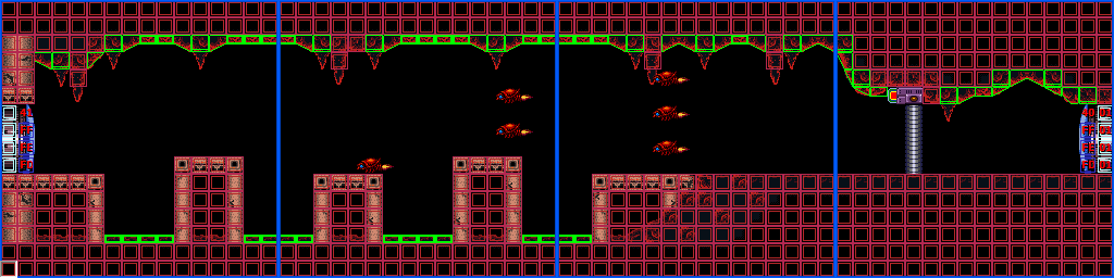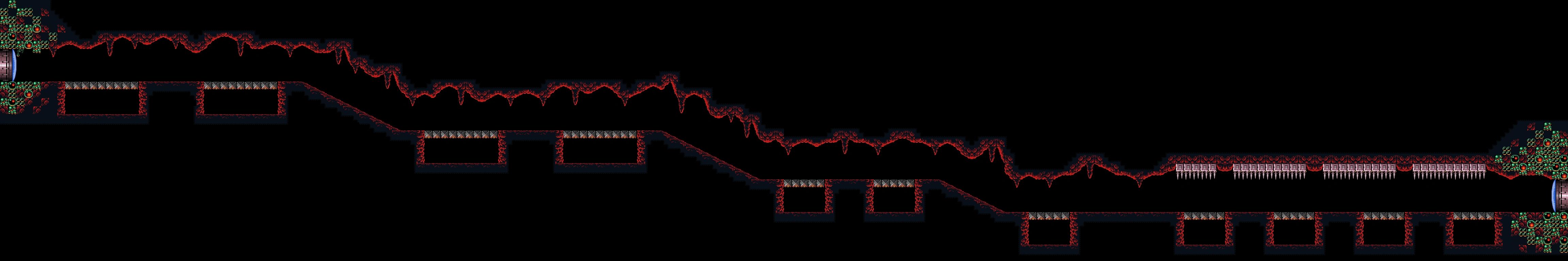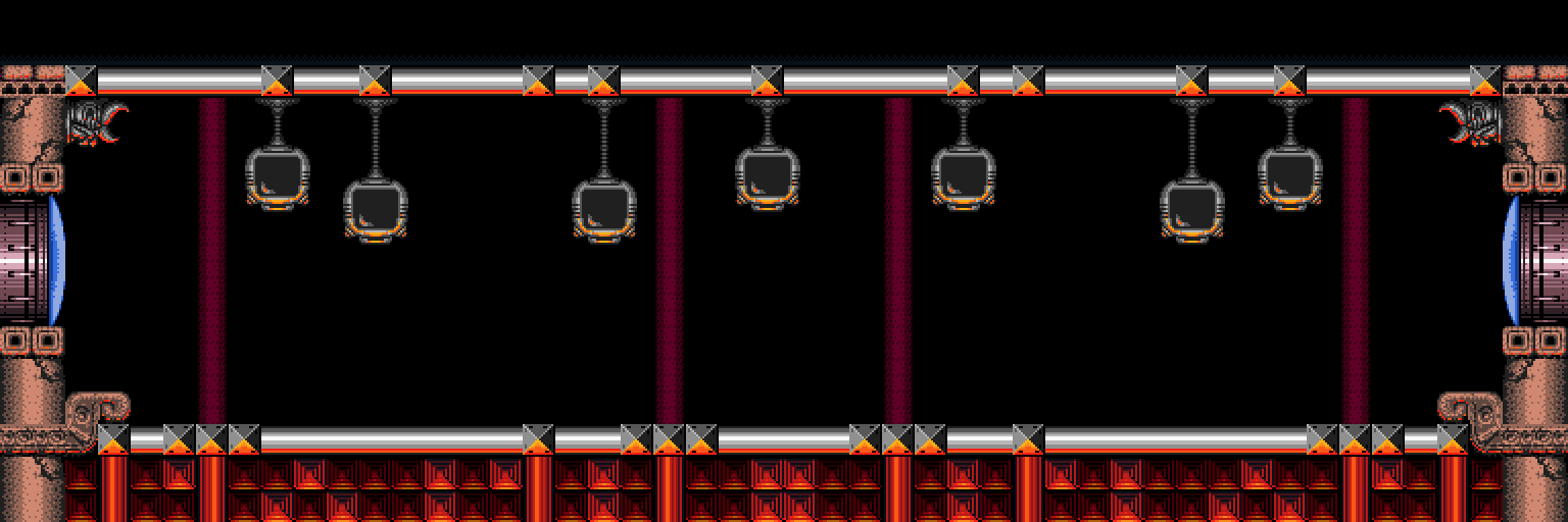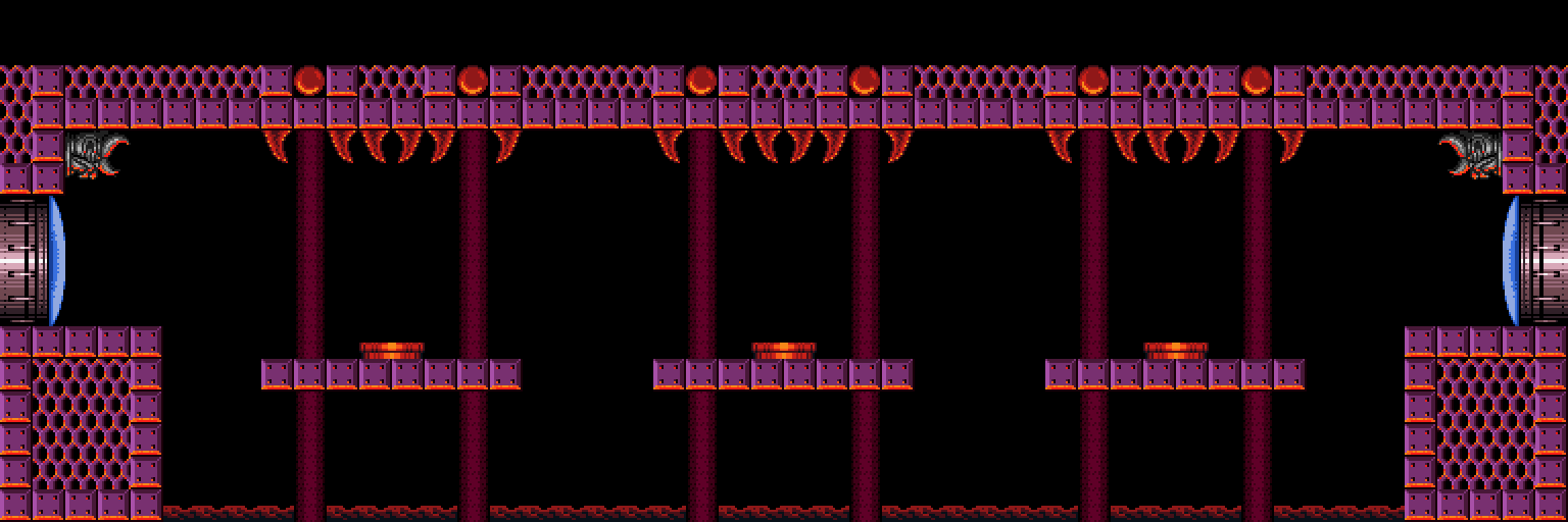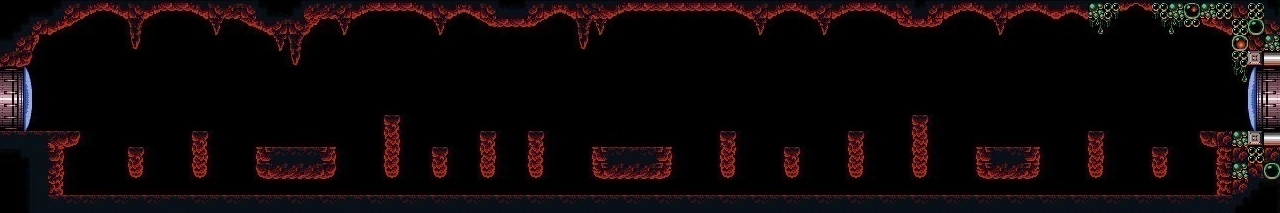 The "Spiky Platforms Tunnel" is a superheated corridor over lava. A Tripper flies back and forth across the lava, and Samus can stand on it to cross. Ceiling pillars with spikes at their ends are in Samus's way; she can best avoid them by morphing while on the Tripper. In the center of the room is a group of flat pillars with spiky ones in between them, and a shutter that extends and retracts from the ceiling at regular intervals. This risks knocking Samus into the lava. On the other side is another Tripper and more ceiling spikes; this Tripper is unable to support Samus's weight and will steadily drop into the lava as it nears the exit ledge.