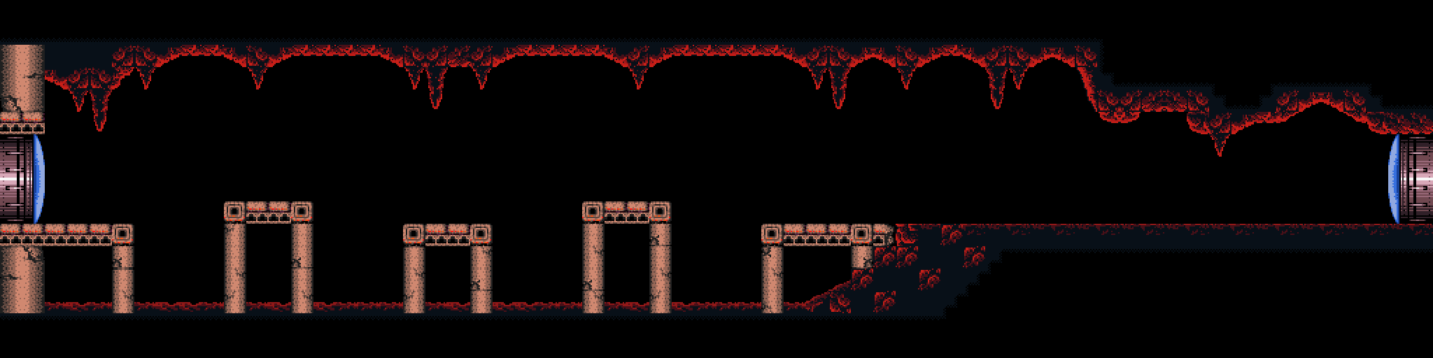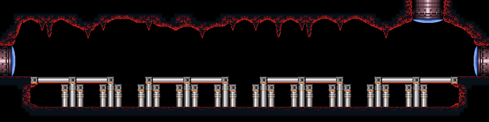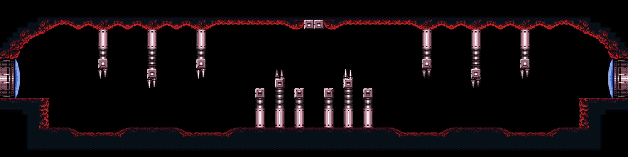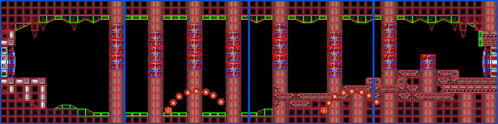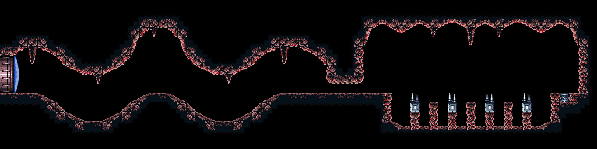 The "Spiky Platforms Tunnel" is a superheated corridor over lava. A Tripper flies back and forth across the lava, and Samus can stand on it to cross. Ceiling pillars with spikes at their ends are in Samus's way; she can best avoid them by morphing while on the Tripper. In the center of the room is a group of flat pillars with spiky ones in between them, and a shutter that extends and retracts from the ceiling at regular intervals. This risks knocking Samus into the lava. On the other side is another Tripper and more ceiling spikes; this Tripper is unable to support Samus's weight and will steadily drop into the lava as it nears the exit ledge.