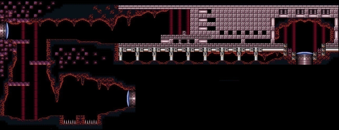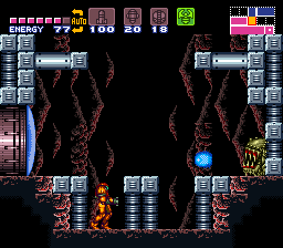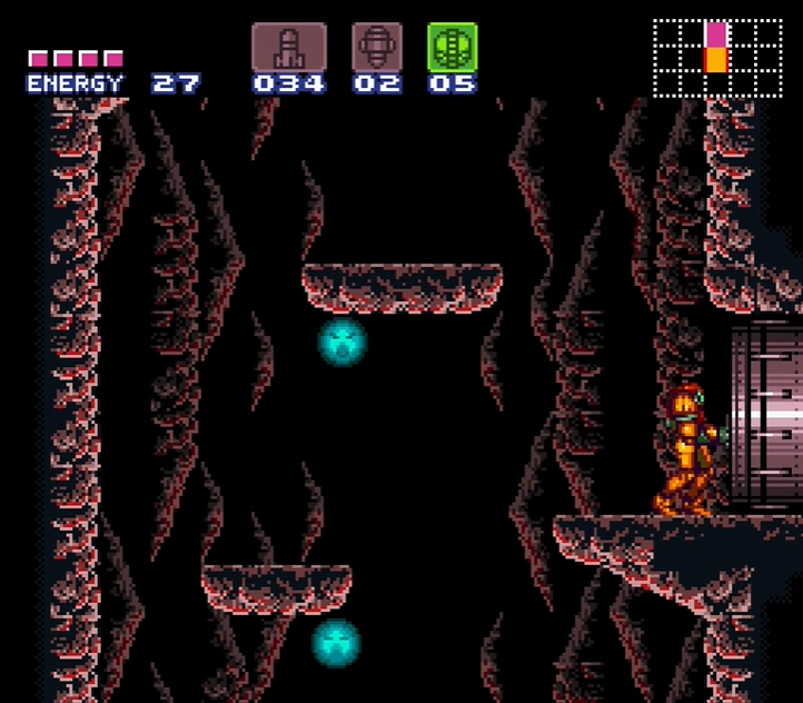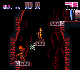 The entire shaft consists of cavernous rock, with multiple ledges and midair platforms. Many of these have small stalactites on their undersides; unlike those of later 3D Metroid games, these are merely scenery and cannot be shot down. The platforms serve as a means for Samus to re-ascend the shaft should she drop or fall down. Many Sovas crawl along these platforms. At the very base of the shaft is a thin floor, which is actually made of Fake Blocks. They can be shot to reveal a secret under-shaft with a single midair platform, an extra Sova and two ledges, leading down to a door. While this can be accessed at any time during Samus's mission, its primary use is as a shortcut back up to the elevator after defeating Crocomire.