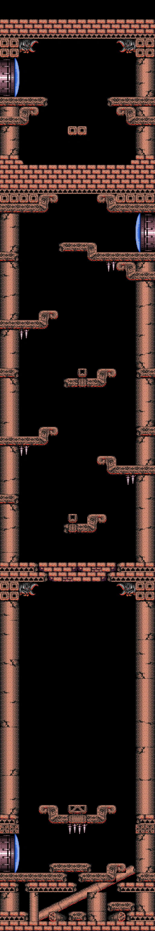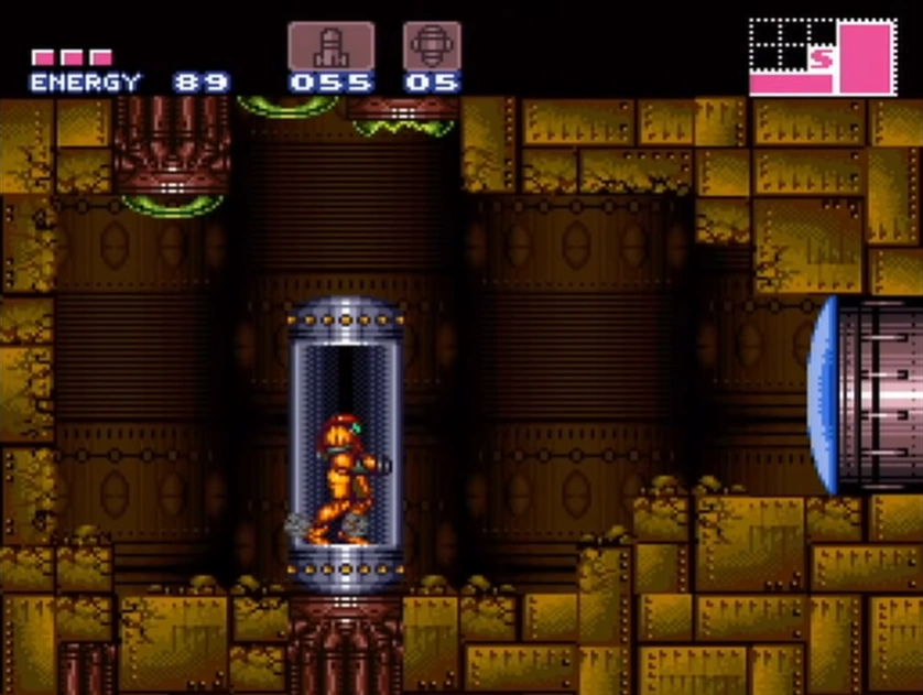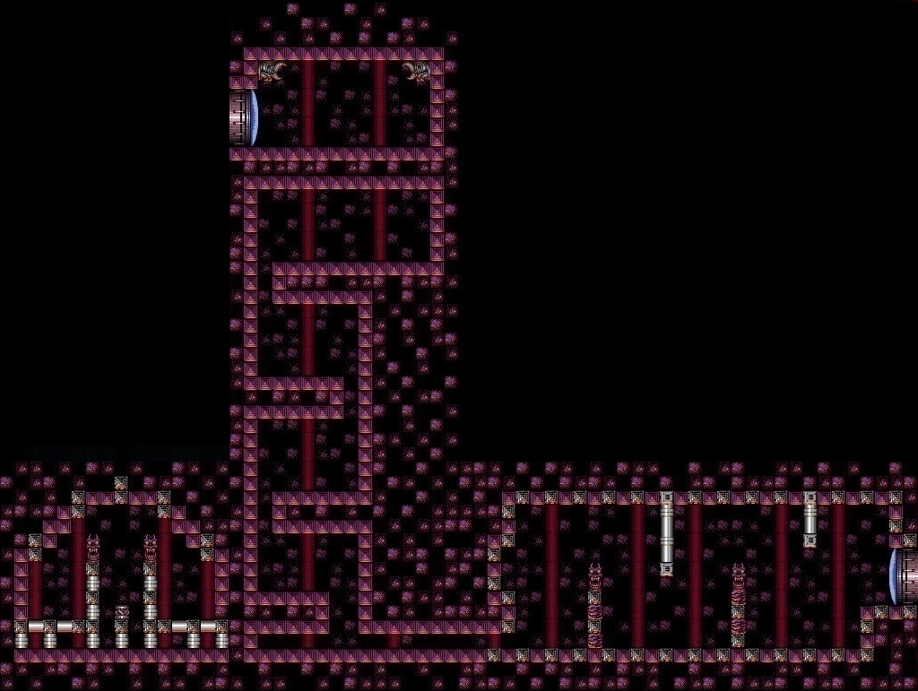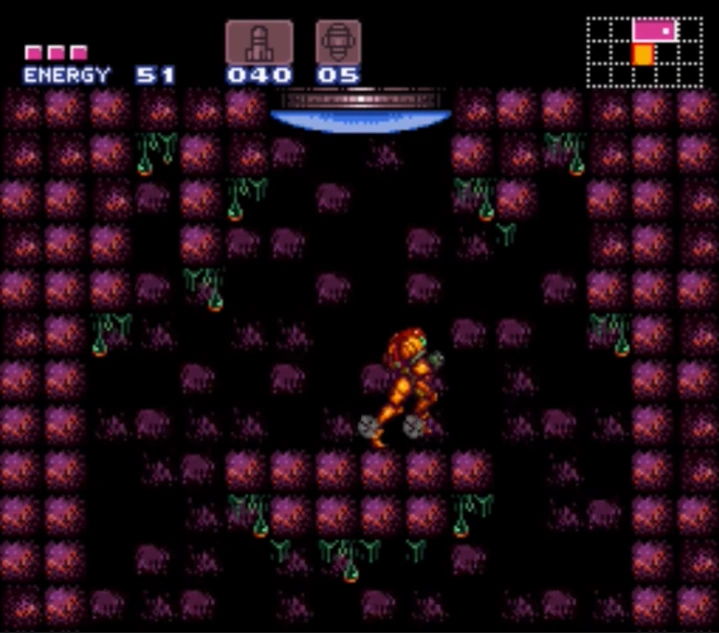 The first part of the shaft has only one platform near the bottom, with spikes on its underside; the lack of platforms is likely to encourage use of the Space Jump and Screw Attack, the latter able to penetrate the ceiling. In the second part of the shaft, there are two midair platforms and four curved wall ledges with spikes underneath them. The shaft ends at the top with a door on the right, and another faux ceiling that conceals a higher door and a midair platform. This door leads into the "Mickey Mouse Room".