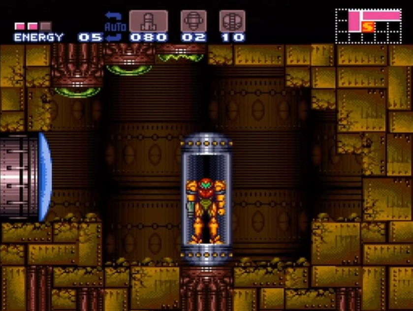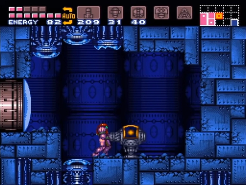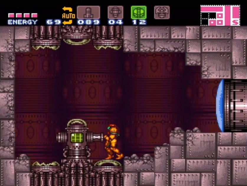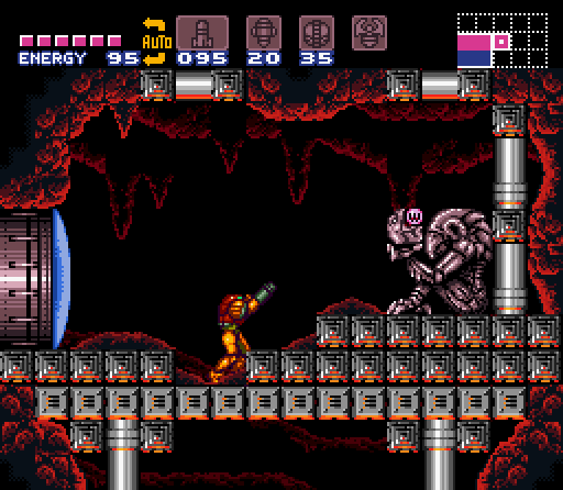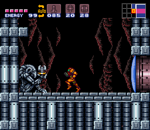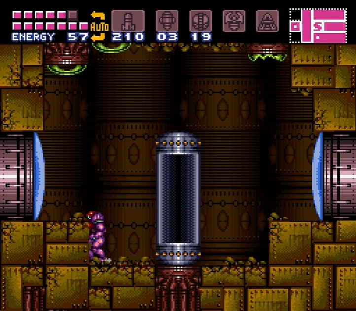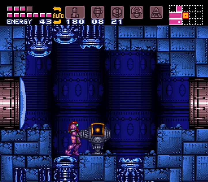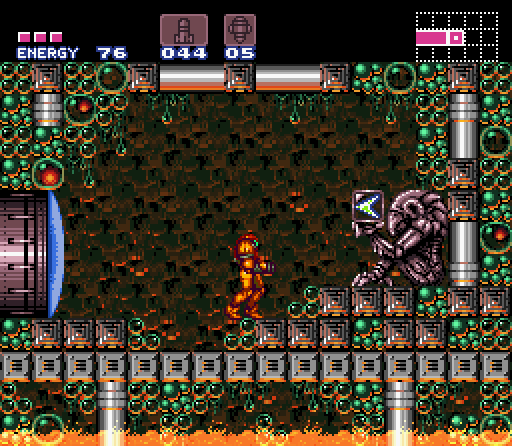 Samus Aran enters the Golden Torizo's chamber through what initially appears to be a much smaller room containing a single Missile Tank. However, the floor will crumble away when Samus steps on it, dropping her into the main chamber below. The Golden Torizo then drops down from a hidden chamber above the Metal Door, initiating the battle. The Metal Door is unlocked once the Golden Torizo is defeated, allowing Samus to enter the next room.