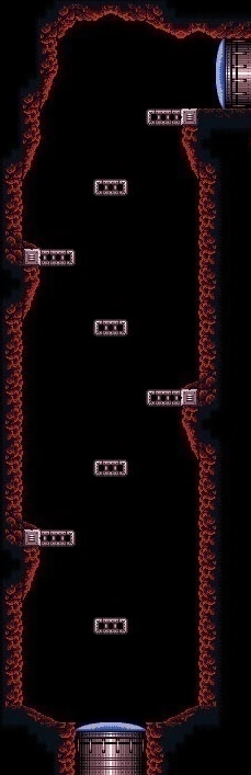 The "Red Zebesian shaft" is a non-heated vertical, mostly natural shaft with four metal midair platforms and ledges each. It provides one of two paths towards Crocomire, and later lower Norfair. As the name implies, it is inhabited by three Red Zebesians and four Silver Geemers.