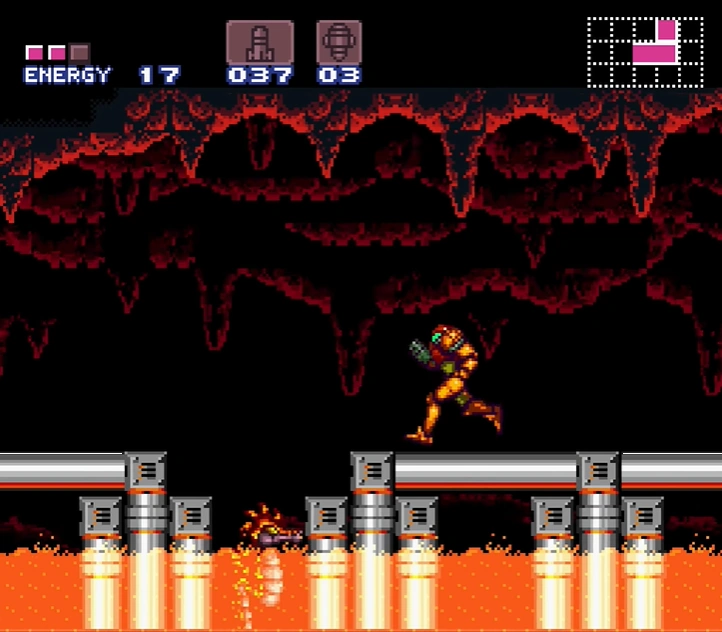 The "Pillar Room" is a superheated corridor. Multiple tall stone pillars are present in the center of the room, with notable fractures. These fractures can be destroyed with the Screw Attack to clear a path forward for Samus. These pillars give way to stonework near the right side. When Samus enters this room, an earthquake begins to occur and scalding-hot lava starts to rise from the floor. Samus must quickly Space Jump and Screw Attack through the pillars to get to the other end. As she is doing so, two swarms of eight Puromi will fly in an arc toward Samus; if she keeps jumping they should pass her by.