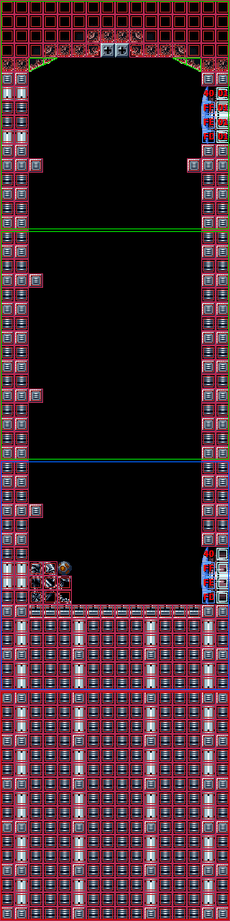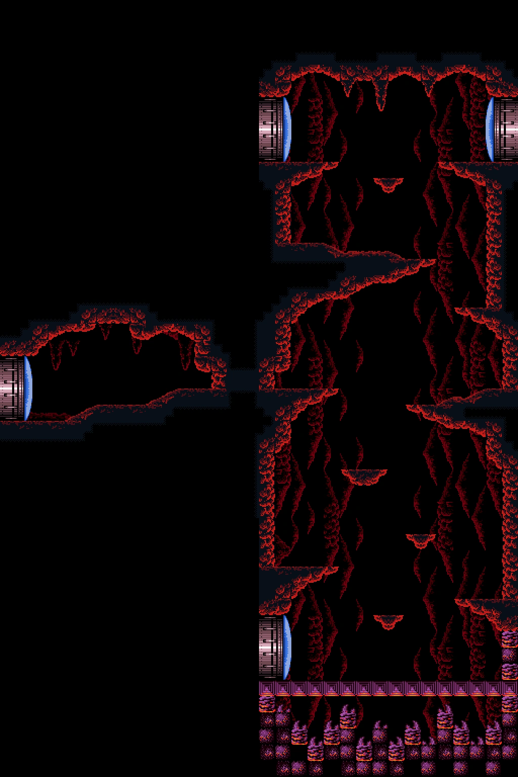The "Viola shaft" is a large vertical shaft with pointy ledges and small midair platforms, each of which is patrolled by a Viola. A flat ledge on the left wall contains a hidden tunnel, accessible both ways, to an alcove with a shutter and an alternate exit/entrance. If Samus has the Wave Beam, she can open it from the back (the front is to the door). While most of the room is natural cave rock, the floor at the bottom is made of a purple constructed material, hinting toward its proximity to Ridley's region of Norfair.