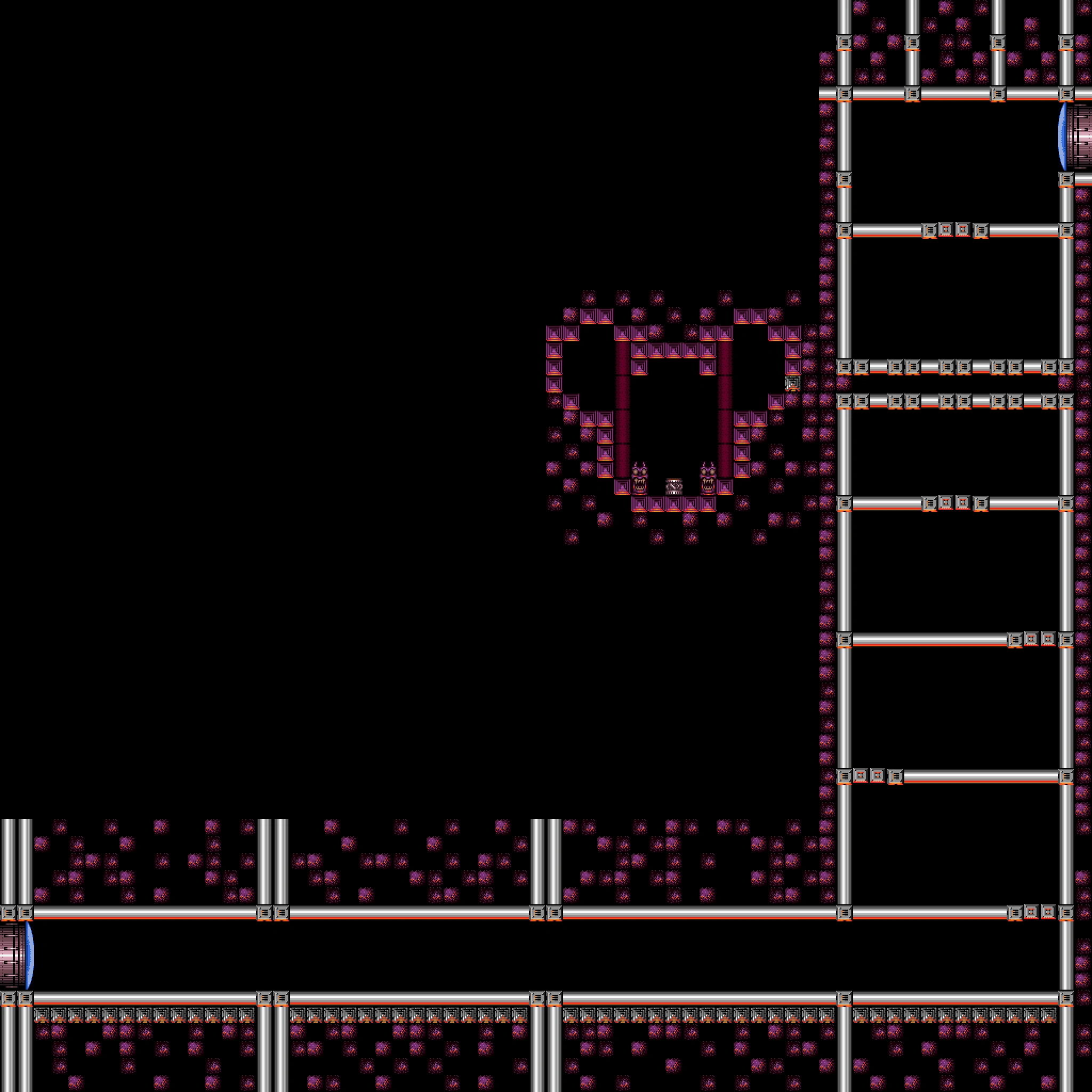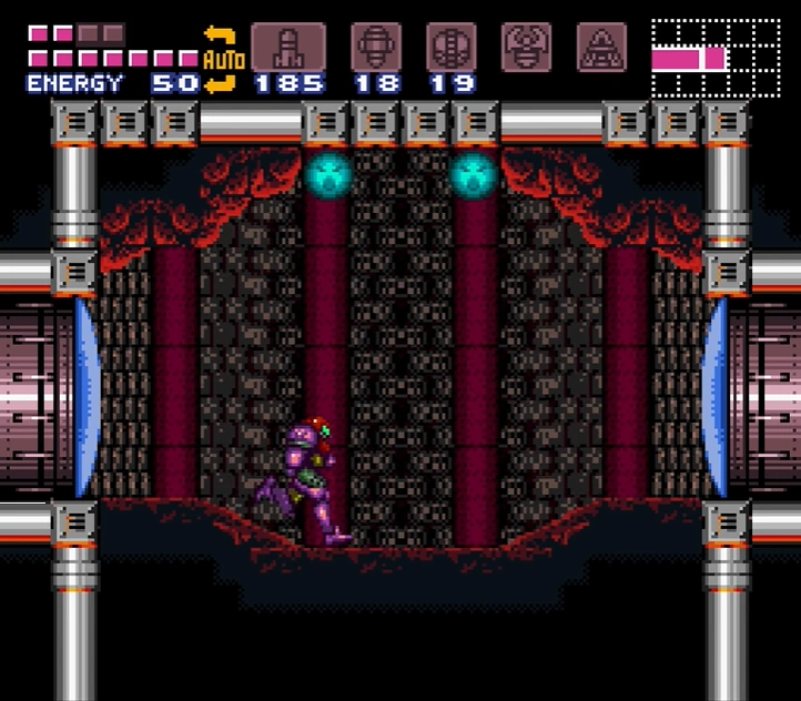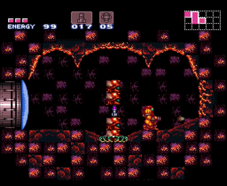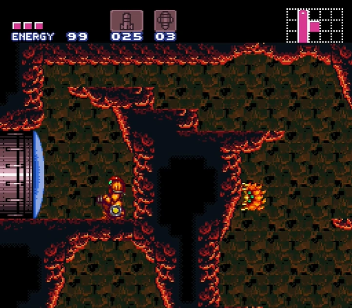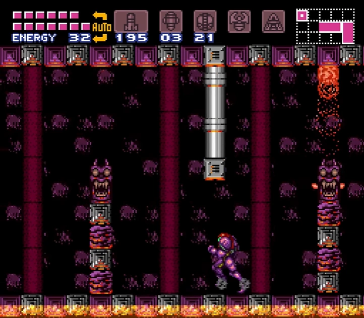 As with Metroid, the pillars are crawling with Violas, and numerous Geegas spawn from different points in the lava. Therefore, Samus must be careful in navigating the room to conserve as much energy and ammo as possible for the fight with Ridley ahead. The pillar platform that is closest to the door, as well as the ledges and ceiling in front of it, are covered in the spiky material of a Gadora blocking the door. This material remains even as the Gadora is killed. After Ridley is defeated, Samus leaves lower Norfair through this room, and there is little reason to revisit it.
