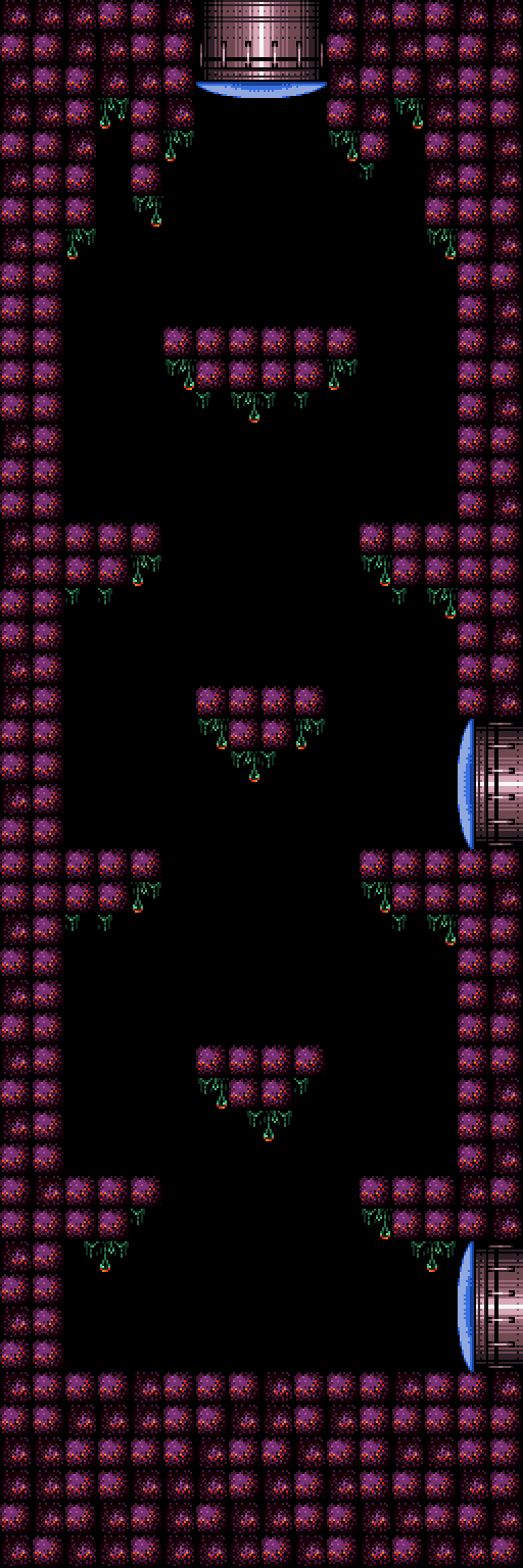The "Purple Shaft" is, as the name implies, a purple-colored, superheated undershaft. No enemies are present here, only multiple wall ledges and three midair platforms with a dripping green fluid underneath them.