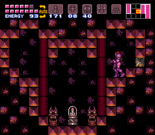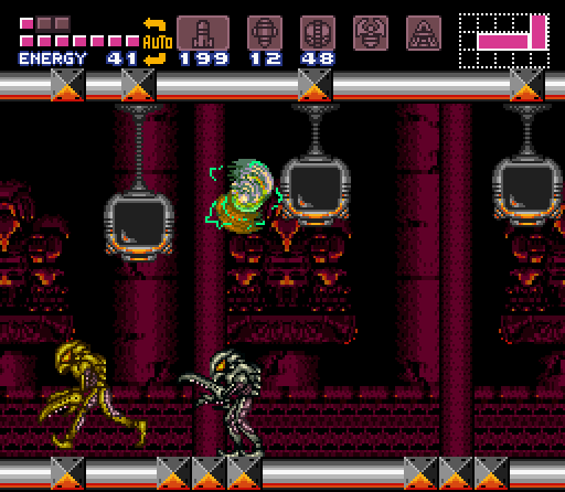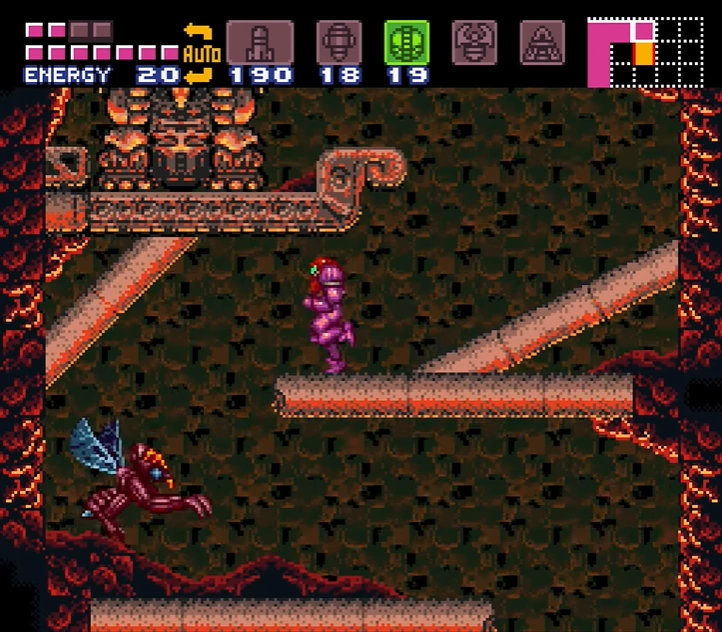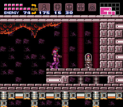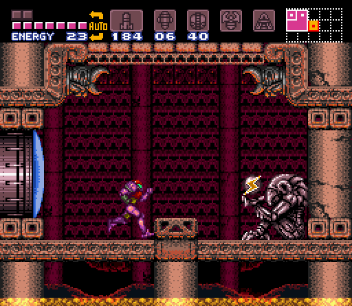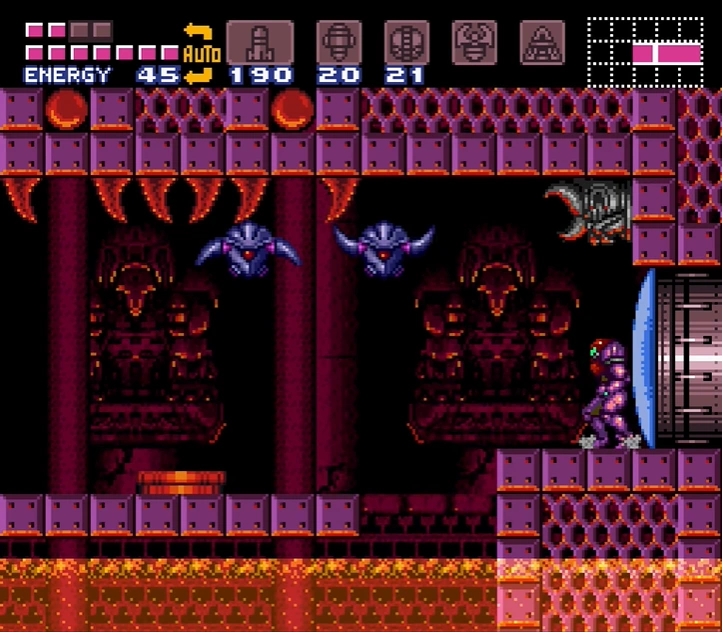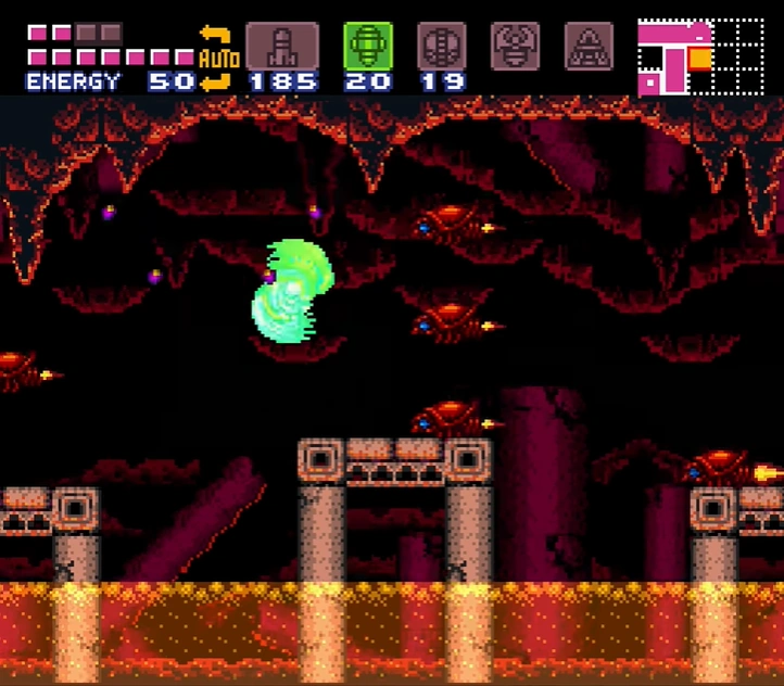The "Fast Ripper Room" is a superheated corridor, partially filled with scalding-hot lava. Six Ripper IIs zoom back and forth across the room at an increased speed, hence the name. This is Samus's first chance to use her new Screw Attack against enemies, as it is the only way to kill the Ripper IIs without damage. While her Space Jump allows her to jump across the corridor, there are stonework platforms in the lava that Samus can drop to if necessary. The last of these platforms ends on solid ground, with a green Shutter up ahead that Samus can open using a Super Missile. This can be opened with a glitch from the other side, allowing the Screw Attack to be collected without fighting the Golden Torizo.