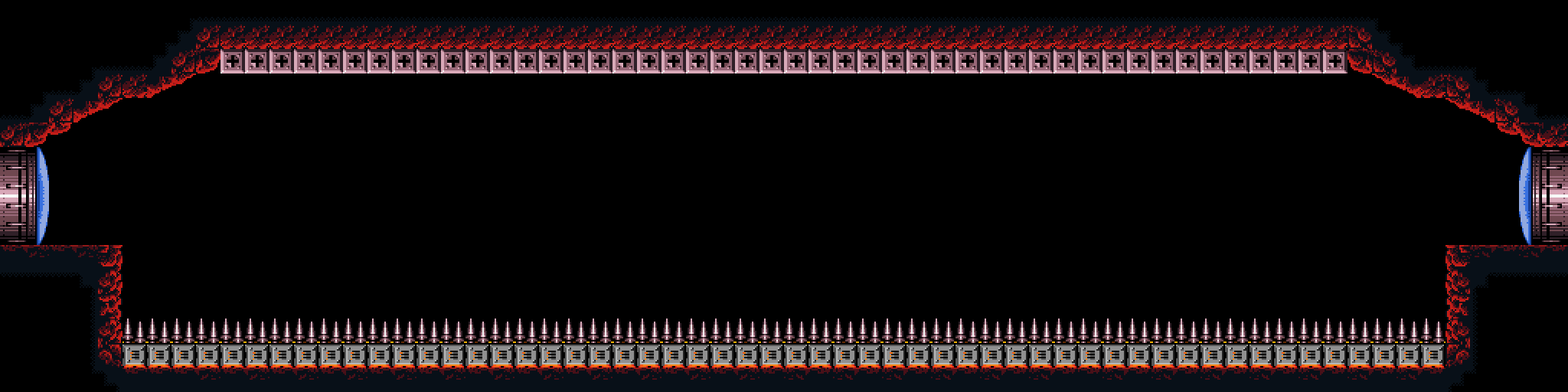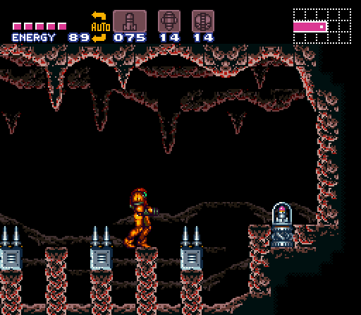 There are two main areas of the Grapple Crossing, divided by a large rock column and a Shutter. The first section is populated by Funes, and Samus Aran must cross by jumping between four suspensor platforms that move up and down. The second section features Grapple Points over a large bed of metallic spikes (with a few Pit Blocks to fall through); while it is possible to cross this area before defeating Crocomire, it is strongly recommended to have acquired the Grappling Beam first to make it easier.