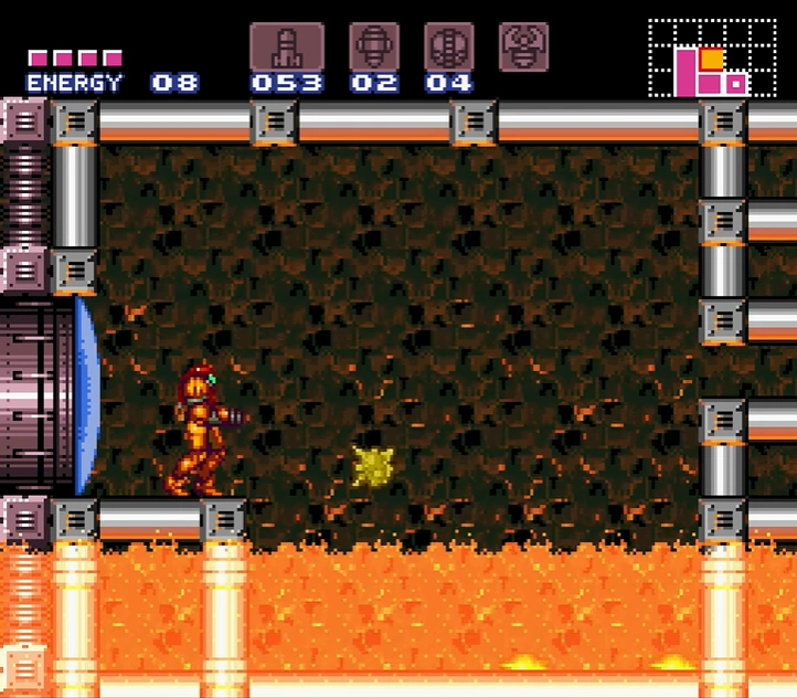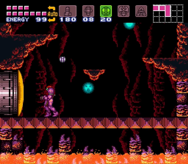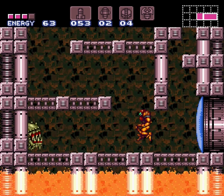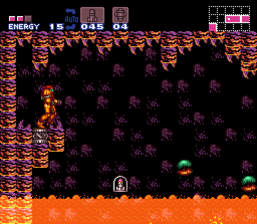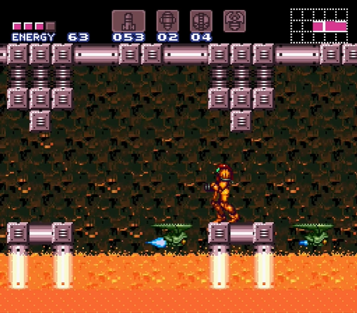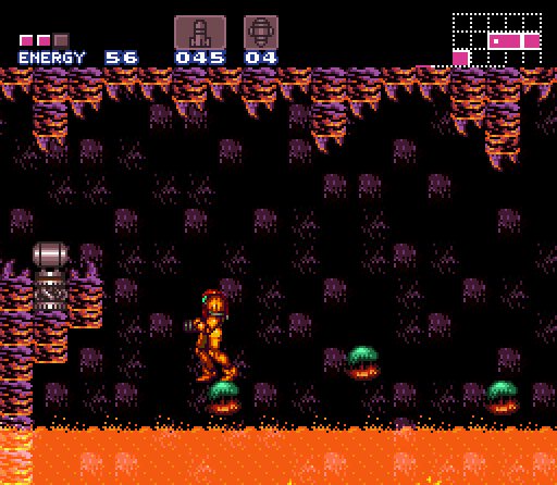 The Upper Norfair Farming Room is a room between Bubble Mountain and the long path leading to the entrance shaft. It is divided into two halves. The upper half features a gap between two long ledges, with a single midair platform in the middle and a line of Fake Blocks at the base of the gap. Shooting these drops Samus to the lower half, where a slightly wider midair platform sits above a shallow pool of lava. The floor tiles here are artificial, containing eight Koma heads. Gamets spawn indefinitely from a corner of the lava, giving Samus an opportunity to "farm" energy/ammo, hence the room's name. A blue shutter blocks a door on the lower left, which leads towards Crocomire. Samus cannot get through it without the Wave Beam.