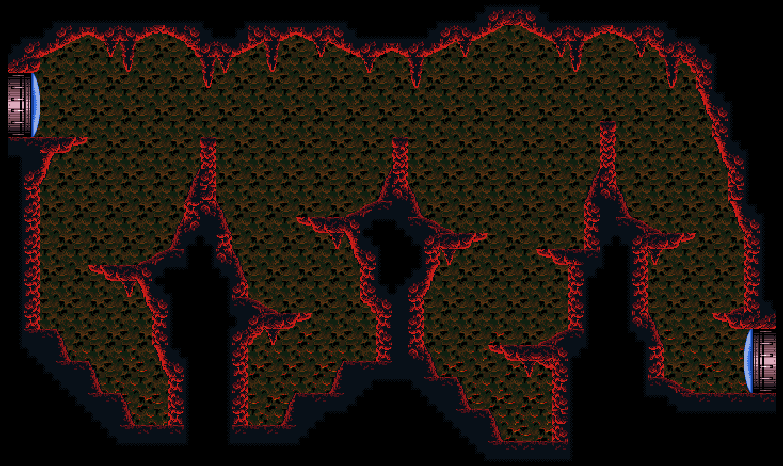 The "Ice Beam Lava Room" is a short, artificial passage inhabited by Trippers. It is superheated, consisting of a natural floor and metallic architecture. Two platforms constructed from blocks and pipes are built into the floor, with each door on a ledge; these are on the surface of a pool of lava. Samus can use these platforms and three Trippers flying back and forth between platforms to cross the room safely.