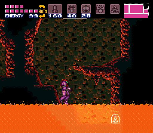 The "hilly path" is a long horizontal corridor with a curving floor, hence the name. Lava Tides rise and fall in this room, making it dangerous for Samus to stand in the grooves between "hills" for long. At the end of the passageway is a rocky overhang, with a Morph Ball-sized gap between it and the floor. Through here is a smaller chamber with three stalactites on the ceiling and seven pillars, four of which are topped with spikes. The other three can be safely jumped across to a ledge on the right wall, which contains a Missile Tank. Two Metarees inhabit the "hilly" portion, and Gamets spawn in groups of five from the lava in the pillar portion.