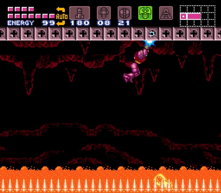 Croc's pit, also known as Croc's cave, is a room in Super Metroid where Samus Aran battles Crocomire, the Mini-Boss of Norfair. Croc's pit is a long, straight tunnel composed of reddish-purple rock. Small red bushes can be seen growing sparsely. Scalding-hot lava runs throughout the pit, rising and falling in steady Lava Tides; this room is one of the first places where Samus can encounter this hazard. On the right side of Croc's pit, a flimsy bridge crosses over a pool of lava, while Grapple Points line the ceiling. On the left side of Croc's pit, another smaller pool of lava is blocked off by a wall covered with spikes.