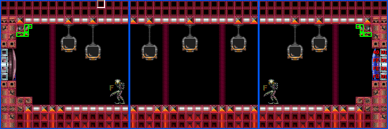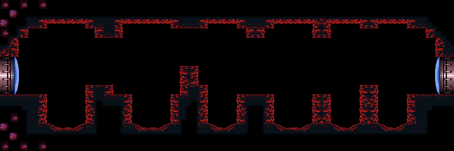 The "Holtz hall" is another heated corridor with a floor of scalding-hot lava. Six Holtz are present here, in addition to Zebbos that spawn from three Air Holes. This gives Samus one of several opportunities to refill her energy and ammunition before she confronts Ridley. Three "faces" of bejeweled red eyes and sharp teeth are built into the ceiling; unlike that of "Mini-Kraid's room" in Super Metroid, the teeth cannot harm Samus if she touches them.