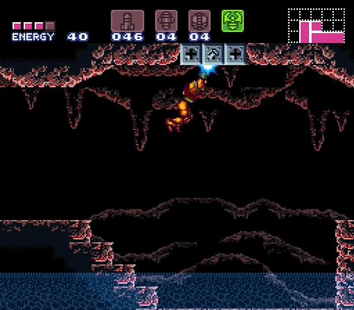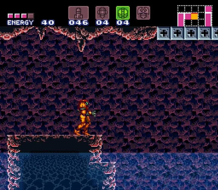 "Pond B" is another corridor like the previous pond. However, it is larger and contains two large pools of water. An Air Hole that spawns five Gamets at once is at the bottom of the first pool. Like the previous pond, natural stairs allow Samus to escape either pool if she falls in. After grappling to the other side, Samus can open a green Shutter in her way with a Super Missile to return to Norfair's edge.