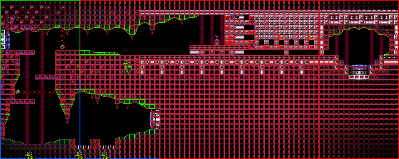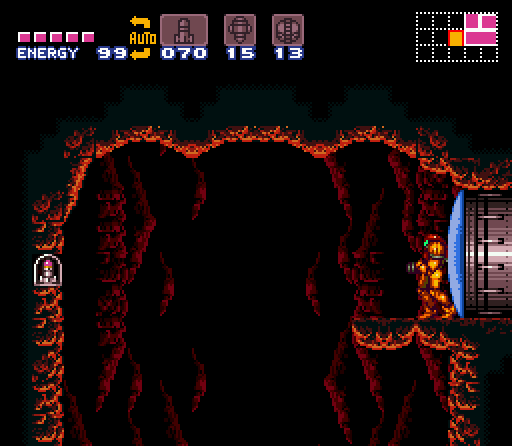 This room is only meant as a shortcut from "Bubble Mountain" to the entry shaft of Norfair after attaining the Speed Booster. It is impossible to go through this room to first access "Bubble Mountain", since the Speed Booster is beyond said room, but it is a very fast passage through to each side of Norfair. There is a Save Station through a Blue Door on the left, and another Blue Door leading to a room next to "Bubble Mountain" on the right.