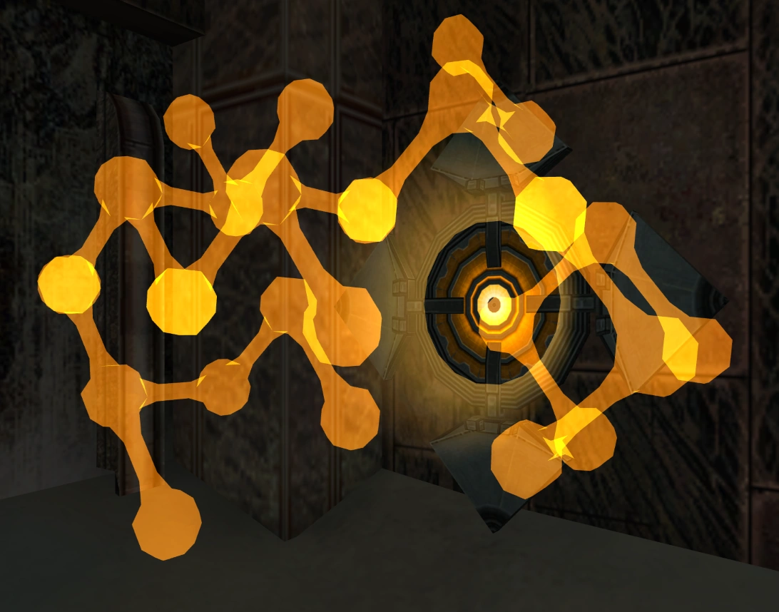 Luminoth Lore Projectors are the mechanism by which Luminoth Lore is stored across Aether. The projectors feature a yellow circle with a single dot in it (resembling the eye on the back of Dark Samus's hand), surrounded by a brown border and a darker brown frame with points, that project a holographic word in the Luminoth language, with a glow of the color of that area. In Metroid Prime 2: Echoes, Samus can scan these projectors to download the Lore to her Logbook. After she does this, however, the hologram will fade into the mechanism and it will shut into a metallic circle with a single hole in the center. Scanning it states that it is locked permanently, which is a common feature among most Lore mechanisms that Samus encounters. Initially, Samus' Translator Module is unable to translate all Luminoth Lore, but upon visits to the Sentinels of each temple on Aether, they will update her Module to translate Violet, Amber, Emerald, and Cobalt holograms, allowing her to scan all Lore.