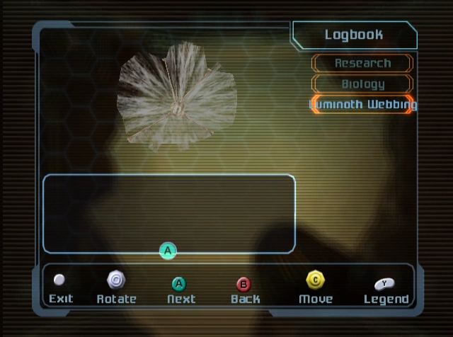 Luminoth Webbing appears within the unused Logbook of the Metroid Prime 2: Echoes Bonus Disc. Housed within the Biology section of the Data Network, the entry itself has no text present but does contain a model. This lack of text is also present with its neighboring biology subject, the Dark Webbing. It is unknown if the lack of a connection to the Luminoth was the result of the Bonus Disc webbing scan being outright removed in the final.