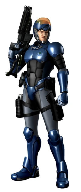 Lyle Smithsonian is a male, Caucasian human who stands at the same height as James Pierce. He has light brown hair with bangs, reddish-brown eyes, and a prominent nose. He wears a Galactic Federation Power Suit equipped with the standard Federation handgun, Submachine Gun, and Freeze Gun, plus an assault rifle. He is also entrusted with the 07th Platoon's explosives.