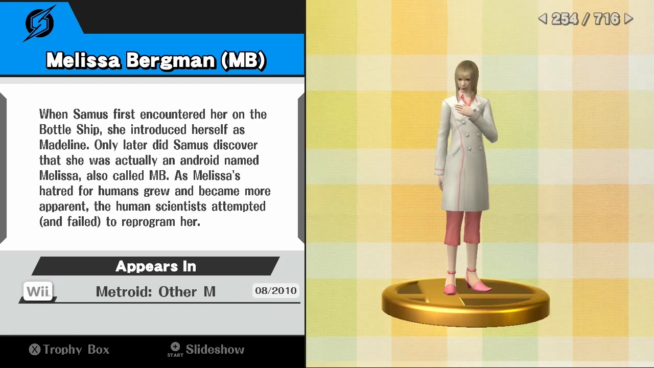 "When Samus first encountered her on the Bottle Ship, she introduced herself as Madeline. Only later did Samus discover that she was actually an android named Melissa, also called MB. As Melissa's hatred for humans grew and became more apparent, the human scientists attempted (and failed) to reprogram her."
